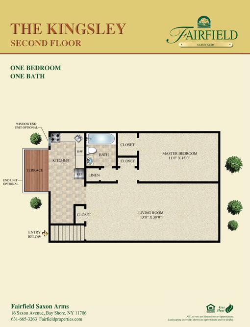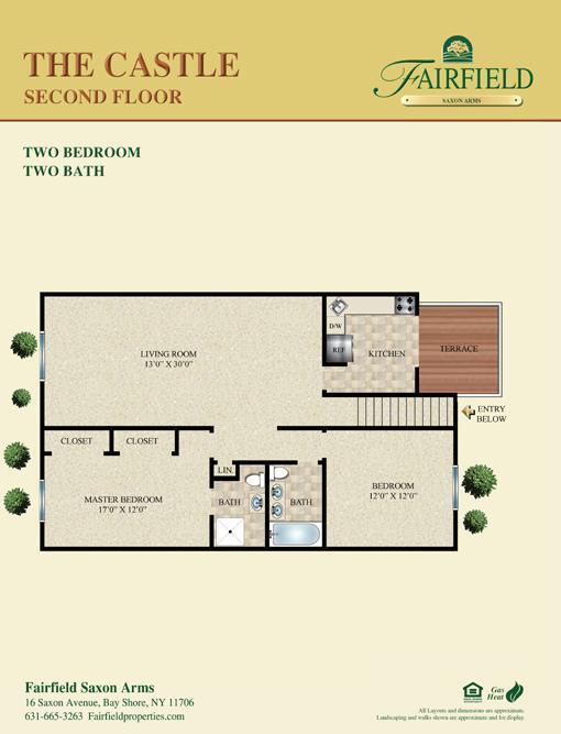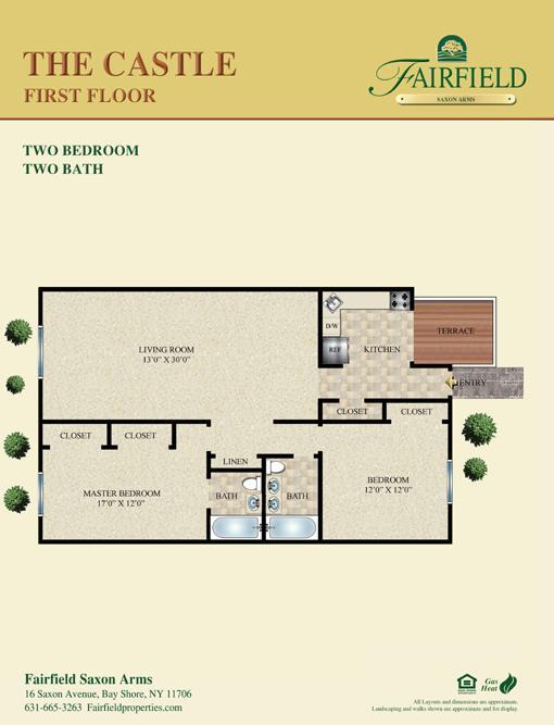 Fairfield Saxon Arms At Bay Shore. Spacious one bedroom/one bath and two bedroom/one and a half bath residences. Featuring: granite countertops, stainless steel appliances, some with carpeting/some with vinyl plank floors. Hi-hat lighting, air conditioning, ceiling fans, two-tone paint, woodgrain style window treatments. Bath with granite vanity tops, ceramic tile, frameless shower doors and rain showerhead. Each includes a large dining area. Select residences with private terrace. We are in top-rated Islip School District.Located near Sunrise Highway. Close to Bay Shore Main Street shops and restaurants and the Long Island Railroad Bay Shore station. Near Brightwaters and Bay Shore Marina the gateway to Fire Island.