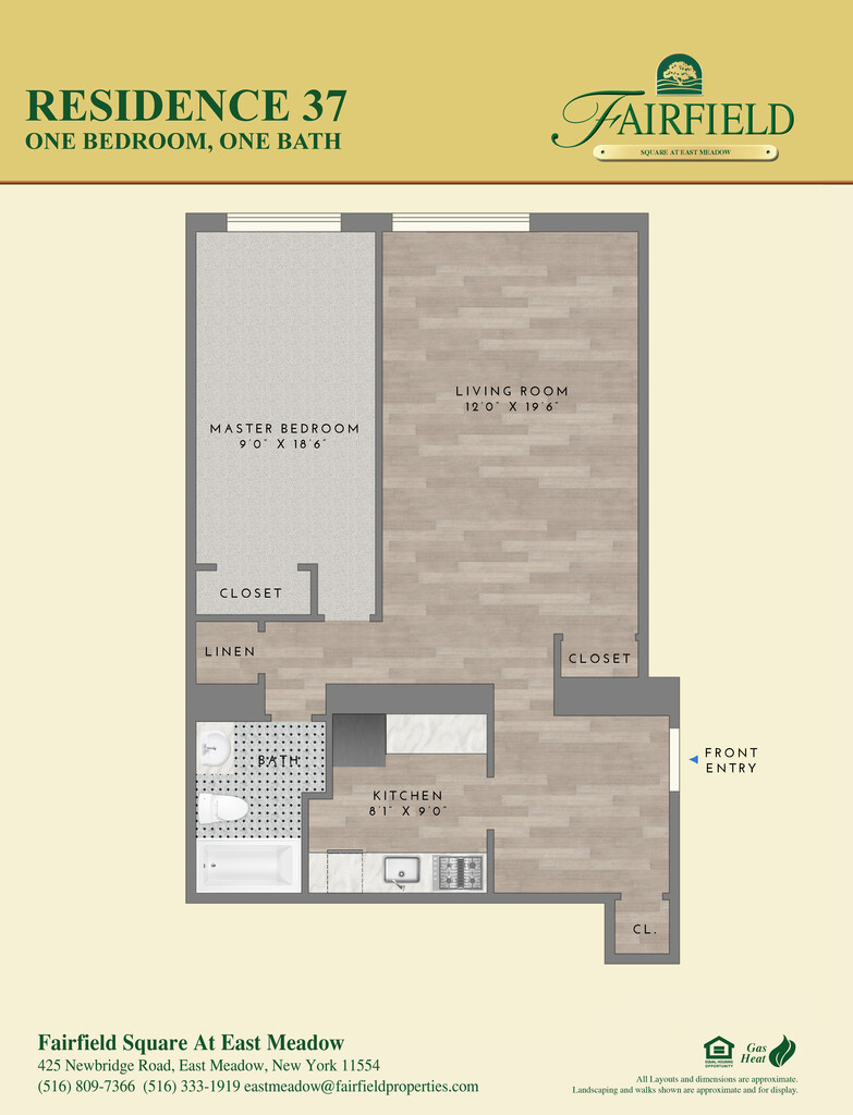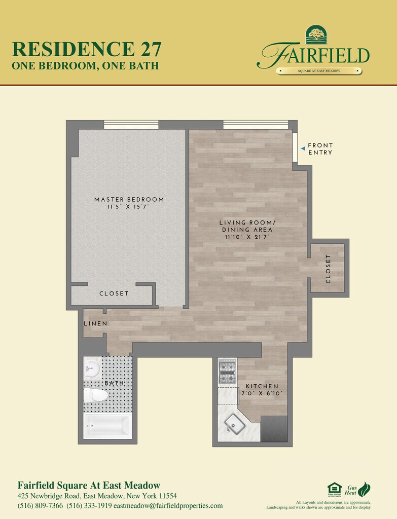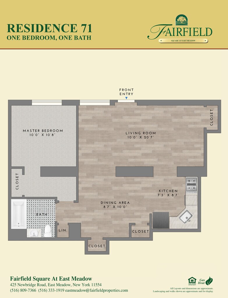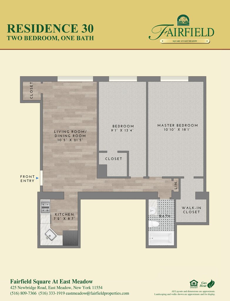 Charm, convenience, and more. That's what you'll find at Fairfield Square At East Meadow, a remodeled elementary school building, in East Meadow, NY. Our spacious one- and two-bedroom apartments for rent feature quartz countertops, tile plank floor, gray premium carpeting, gray paint, ceiling fans, hi-hat lighting, central air conditioning. High ceilings, eat-in kitchens, walk-in closets, and a separate den or office are available in select apartments. Laundry facilities are also located throughout the community.Located in Nassau County and the East Meadow School District, we are close to the Long Island Expressway/I-495, Meadowbrook State Parkway, Wantagh State Parkway, and the Long Island Rail Road. Roosevelt Field Mall is five miles from your door. Plus, the New York Metro area is only about an hour away. Off-street parking and Verizon FiOS are available. Cats and dogs are welcome, too. Stop by for a tour our friendly bilingual staff will be happy to show you around.