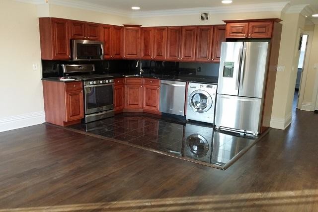 Fairfield Terrace At Lynbrook apartment residences have luxury, modern, kitchens with autumn brown countertop/backsplash and our stunning absolute black granite kitchen floor! We have cherry cabinetry, nickel hardware teamed with stainless steel appliances, a deep basin sink and Moen faucet/sprayer to complete our gourmet kitchen. Rich hardwood flooring, two-tone paint, craftsman crown and base molding, ample closet space, hi-hat lighting and ceiling fans.Each bath features granite and marble floors, granite vanity top on a raised panel vintage style vanity, subway tile with bullnose border, frameless shower doors and hotel-style rain showerhead. For your convenience we have a stainless under cabinet washer/dryer as well for those quick washes. Our residences each have sliding glass doors with verticals that open to a lovely outdoor terrace!