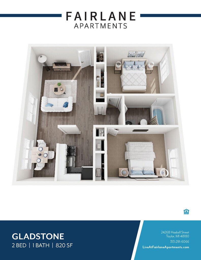 2 Beds, 1 Bath, 820 sq ftAvailable NowCheapest 2 BedroomThis is the cheapest 2 Bedroom at this PropertyModel Gallery