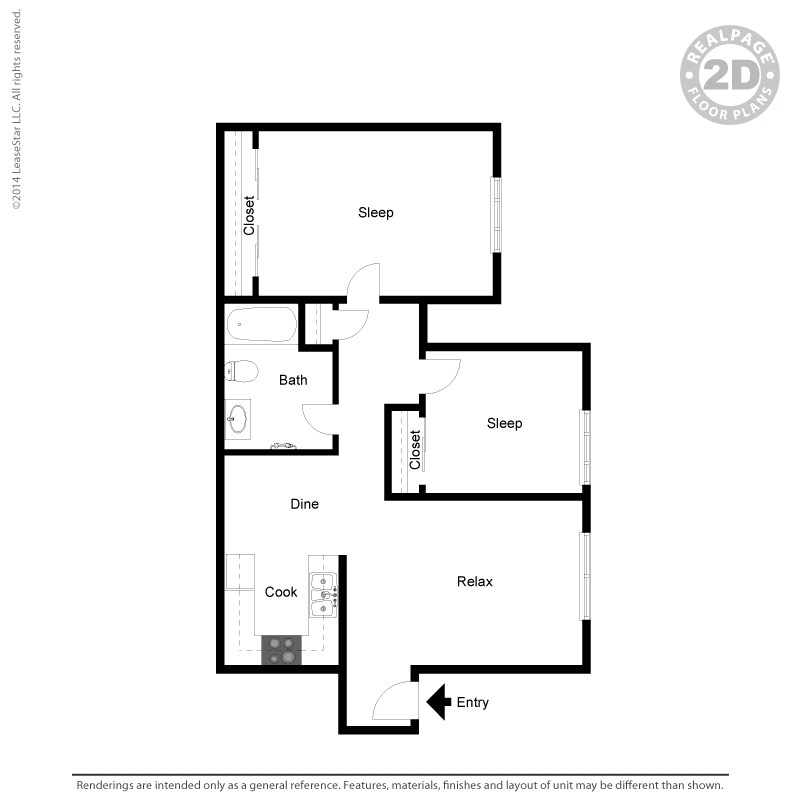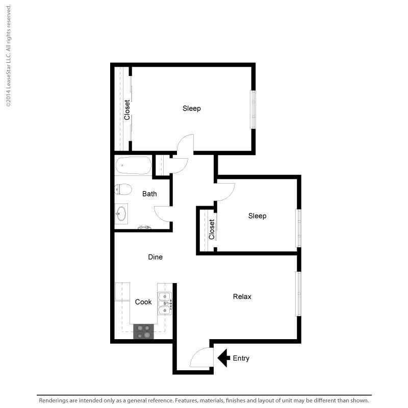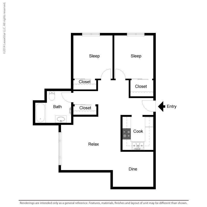 Medium 2 Bed 1 Bath - Floorplan 2 Floor plans are artist's rendering. All dimensions are approximate. Actual product and specifications may vary in dimension or detail. Not all features are available in every rental home. Prices and availability are subject to change. Base rent is based on monthly frequency. Additional fees may apply, such as but not limited to package delivery, trash, water, amenities, etc. Deposits vary. Please see a representative for details.