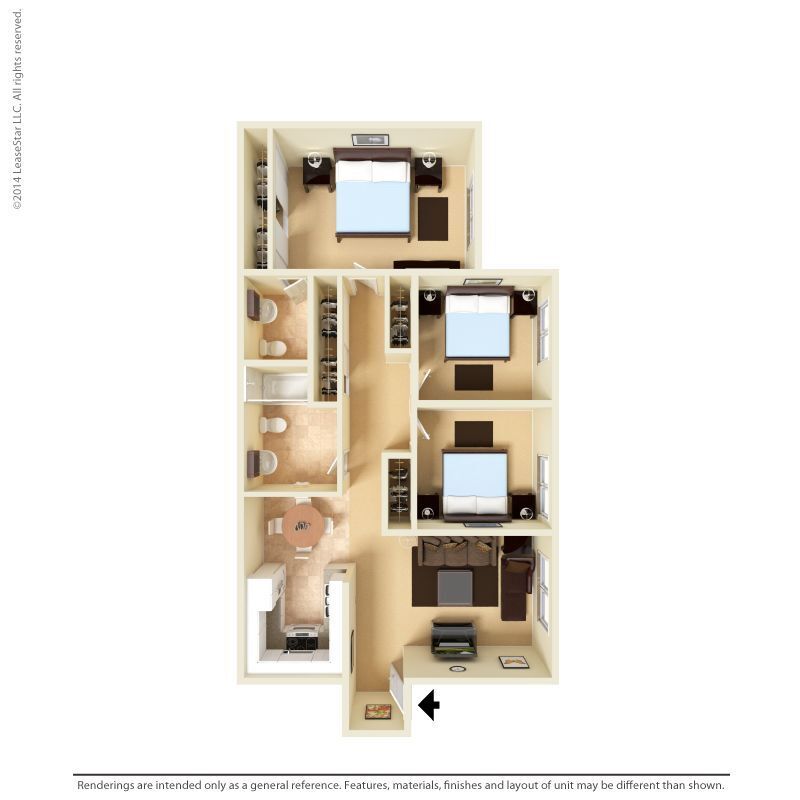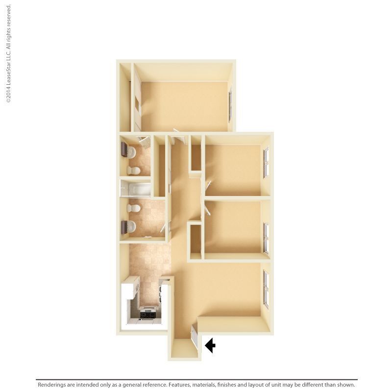 Apartment Model: Extra Large 3 Bed 1.5 BathFrom $4,1963 Bedroom, 1.5 Bath, 1120 sq ftAvailable November 12, 2025Floor plans are artist's rendering. All dimensions are approximate. Actual product and specifications may vary in dimension or detail. Not all features are available in every rental home. Prices and availability are subject to change. Base rent is based on monthly frequency. Additional fees may apply, such as but not limited to package delivery, trash, water, amenities, etc. Deposits vary. Please see a representative for details.