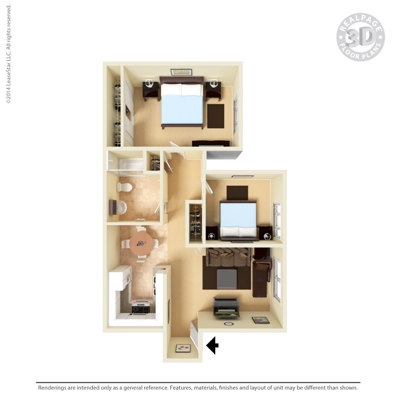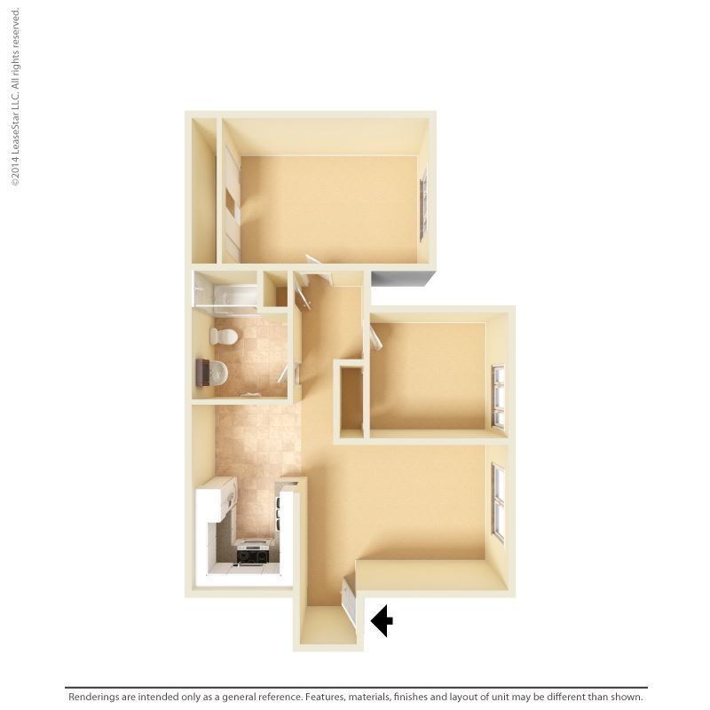 Medium 2 Bed 1 Bath - Floorplan 3 Floor plans are artist's rendering. All dimensions are approximate. Actual product and specifications may vary in dimension or detail. Not all features are available in every rental home. Prices and availability are subject to change. Base rent is based on monthly frequency. Additional fees may apply, such as but not limited to package delivery, trash, water, amenities, etc. Deposits vary. Please see a representative for details.