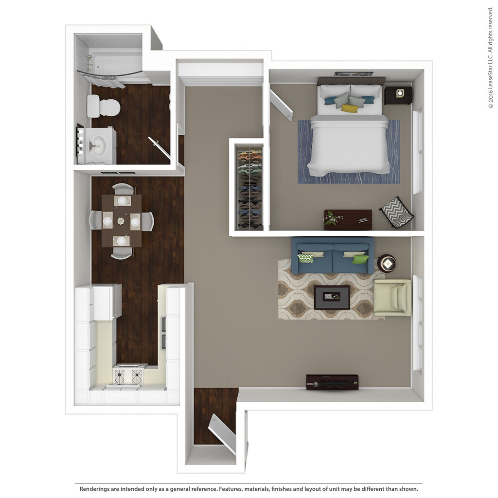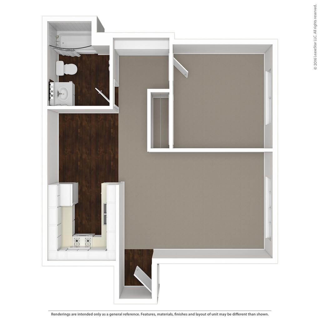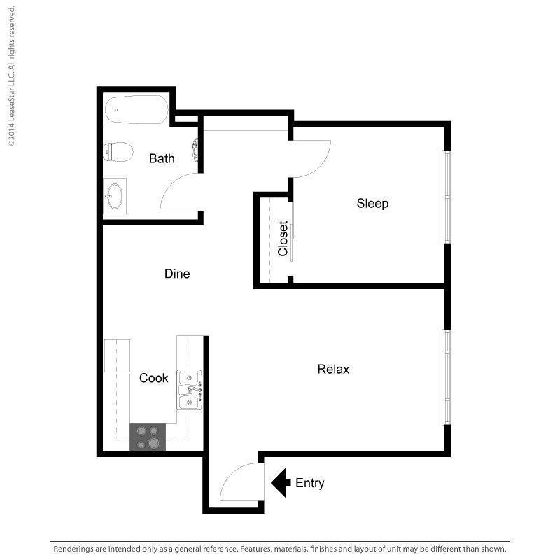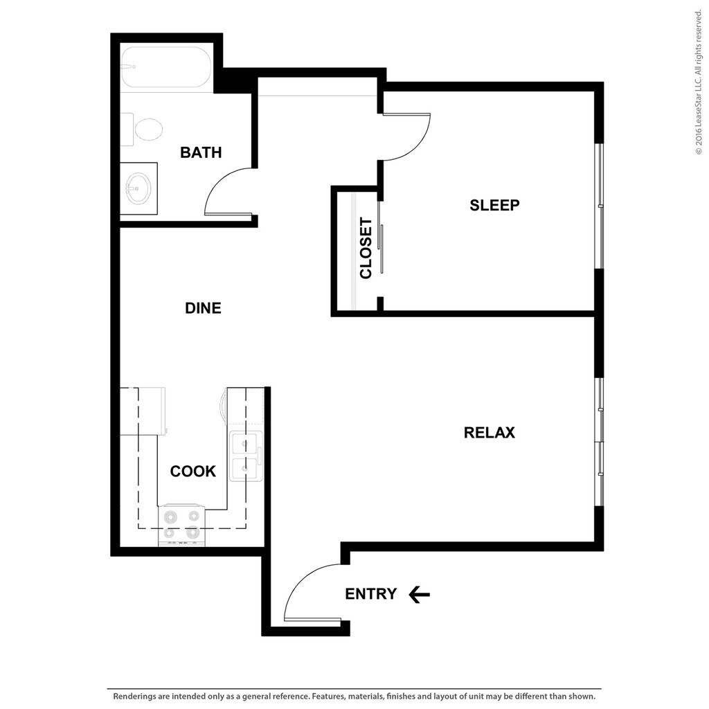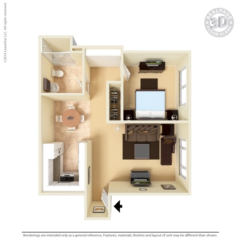 Medium 1 Bed 1 Bath - Floorplan 3 Floor plans are artist's rendering. All dimensions are approximate. Actual product and specifications may vary in dimension or detail. Not all features are available in every rental home. Prices and availability are subject to change. Base rent is based on monthly frequency. Additional fees may apply, such as but not limited to package delivery, trash, water, amenities, etc. Deposits vary. Please see a representative for details.