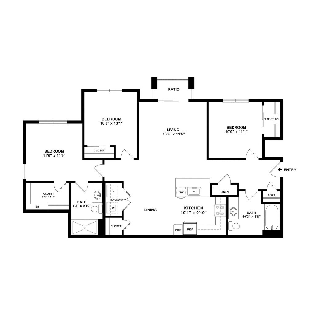 3 Bed 2 Bath - Floorplan 4 Apartment Unit: 6307Apartment Model: 3 Bed 2 Bath$1,5973 Bedroom, 2 Bath, 1212 sq ftAvailable November 8, 2025