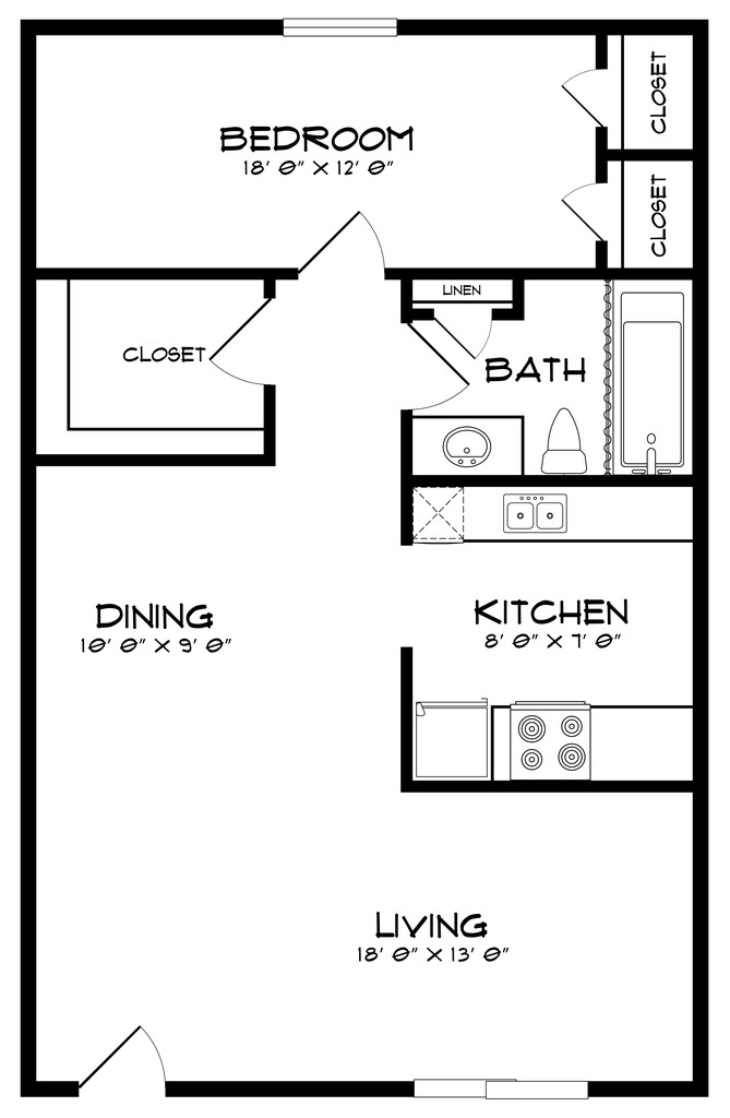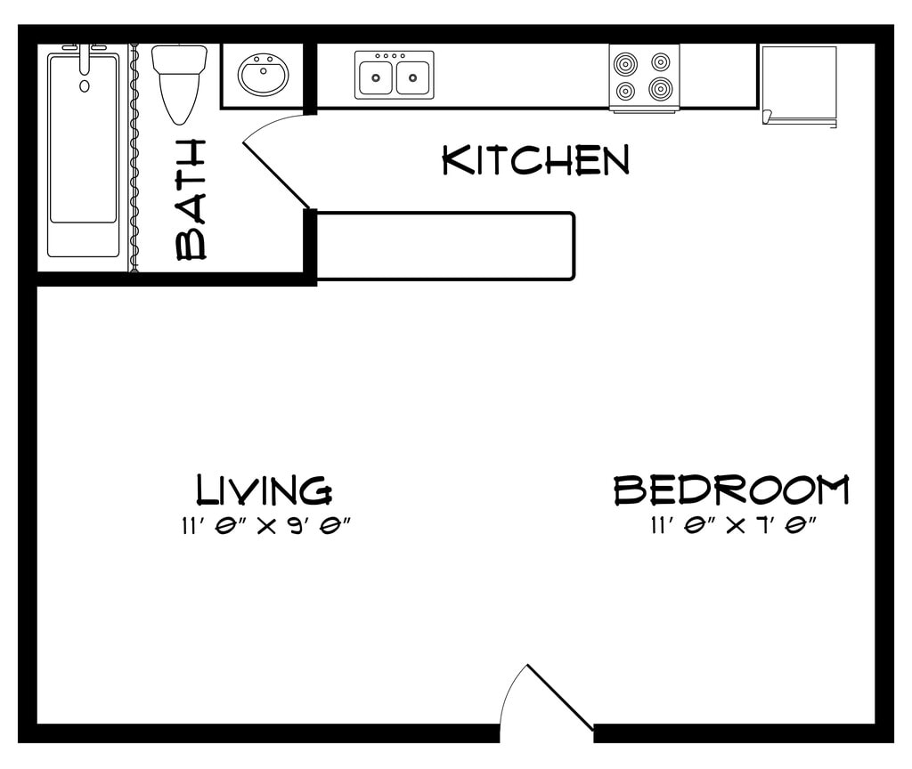 Apartment Model: E1$872Studio, 1 Bath, 300 sq ftUnavailableE1 - Floorplan 1 1 Bedroom