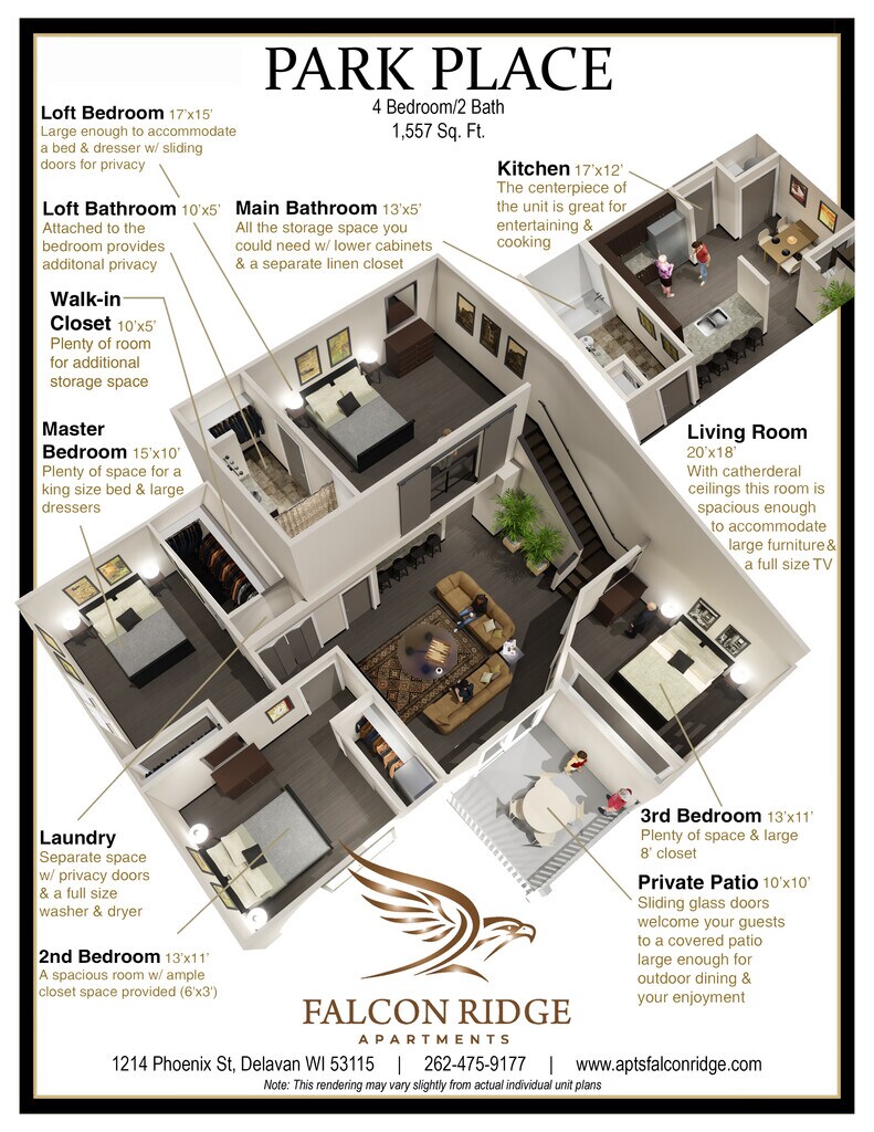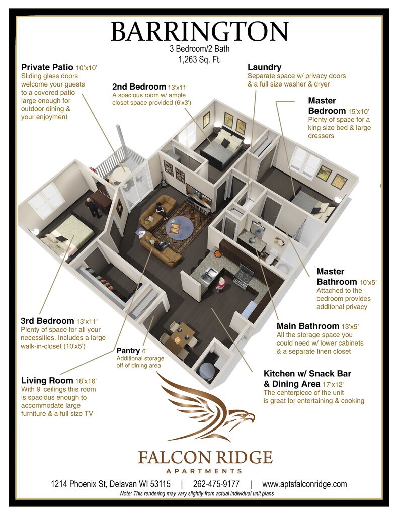 At Falcon Ridge, you can truly live your way. Falcon Ridge has multitude of options featuring 1, 2, 3, 4 and Loft bedroom apartments so you can choose the home that best suits your needs. Our state of the art amenities and friendly staff make Falcon Ridge feel like home. Falcon Ridge is an exciting, NEW neighborhood development located in Delavan, WI adjacent to Fest Park and just seconds from I-43 and Hwy 50. Falcon Ridge Apartments is ready to welcome you home. Elevator, Intercom Entry System, underground parking, full size washers and dryers in every unit, central air, walk-in closets (in most units), LG stainless steel appliances, plank flooring, cable and internet included, fitness center and much, much more.
