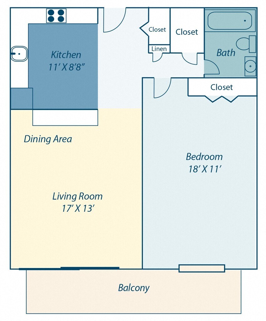 Apartment Model: One BedroomFrom $2,1391 Bedroom, 1 Bath, 638-647 sq ftAvailable NowFloor plans are artist's rendering. All dimensions are approximate. Actual product and specifications may vary in dimension or detail. Not all features are available in every rental home. Please see a representative for details.