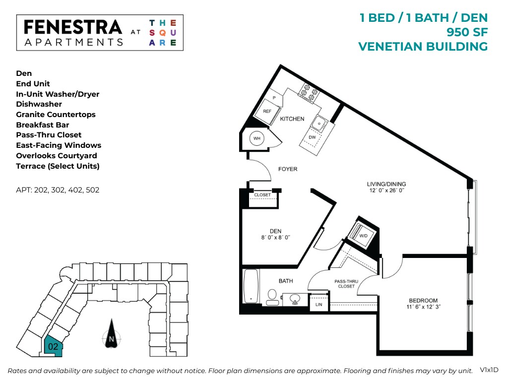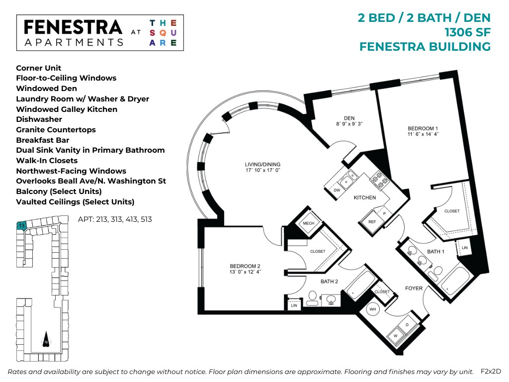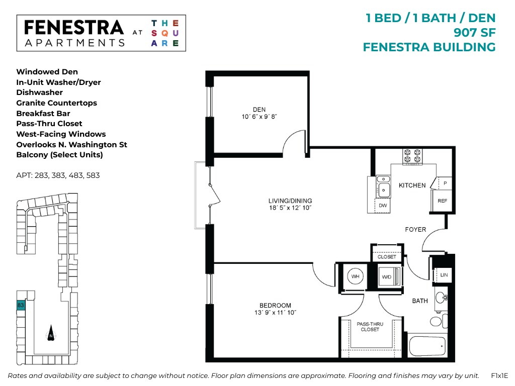 Apartment Model: Fenestra - 1 Bed / 1 Bath / DenFrom $2,3141 Bedroom, 1 Bath, 906-995 sq ftAvailable NowFloor plans are artist's rendering. All dimensions are approximate. Actual product and specifications may vary in dimension or detail. Not all features are available in every rental home. Please see a representative for details.