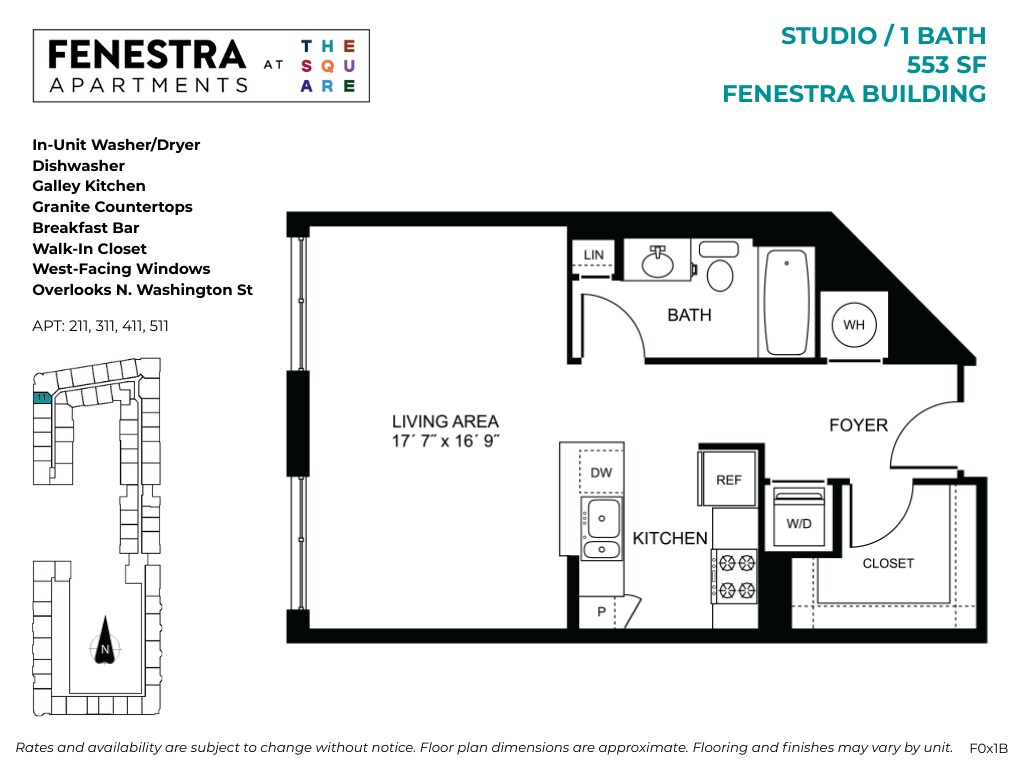 Fenestra - Studio - Floorplan 2 Apartment Unit: 154 Gibbs-F441Apartment Model: Fenestra - StudioFrom $1,896Studio, 1 Bath, 552 sq ftAvailable May 19, 20261 Bedroom