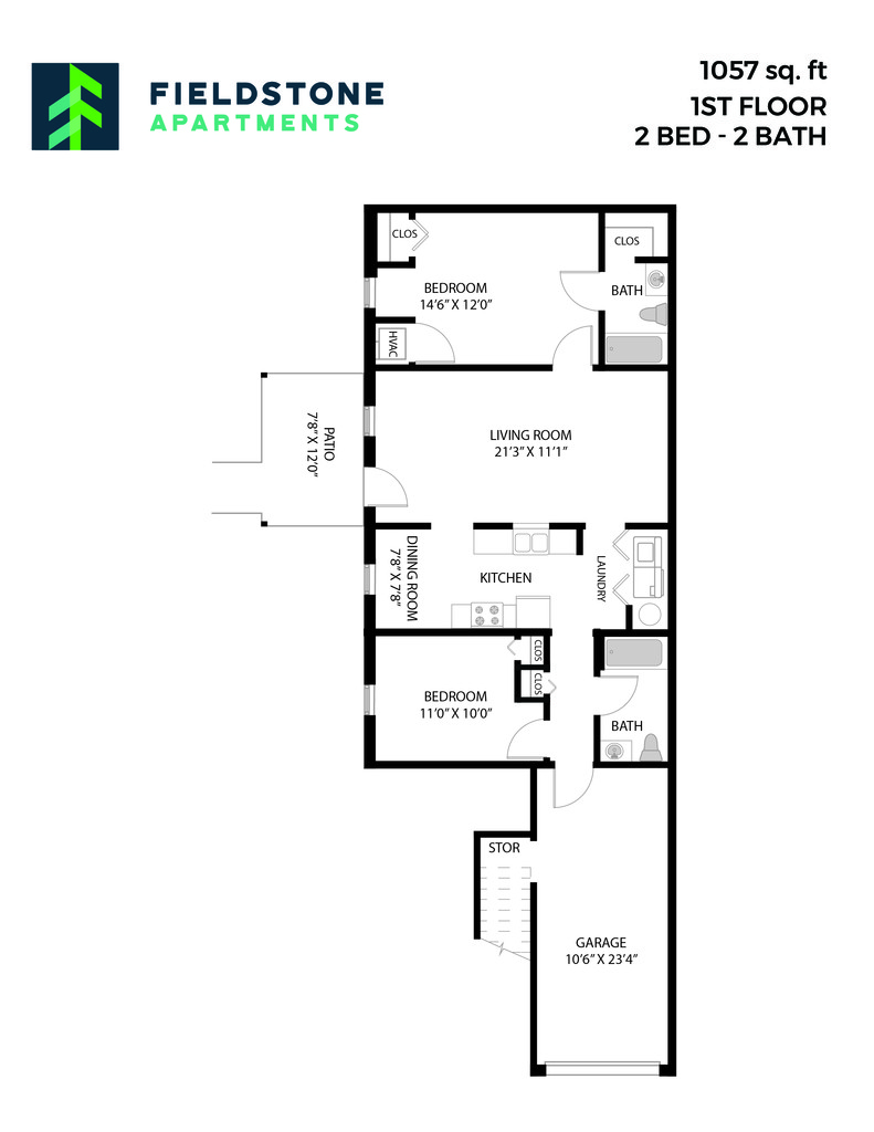 2 Bed, 1.5 Bath - 1,011 sq ft - Floorplan 1 2 Bed, 2 Bath - 1,057 sq ft