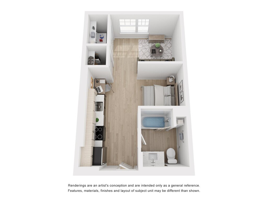 Apartment Model: Studio A$2,016Studio, 1 Bath, 449 sq ftAvailable August 21, 2026Floor plans are artist's rendering. All dimensions are approximate. Actual product and specifications may vary in dimension or detail. Not all features are available in every rental home. Prices and availability are subject to change. Base rent is based on monthly frequency. Additional fees may apply, such as but not limited to package delivery, trash, water, amenities, etc. Deposits vary. Please see a representative for details.