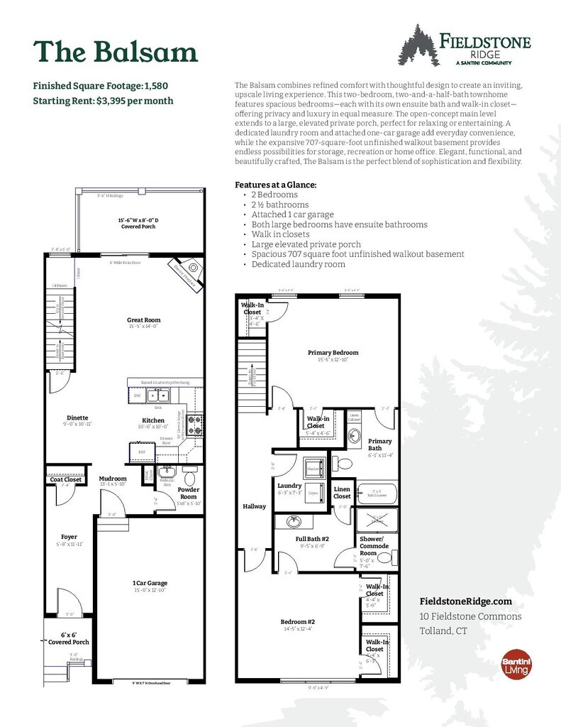 Apartment Model: The Balsam$3,3952 Bedroom, 2.5 Bath, 1580 sq ftAvailable March 7, 2026Floor plans are artist's rendering. All dimensions are approximate. Actual product and specifications may vary in dimension or detail. Not all features are available in every rental home. Please see a representative for details.