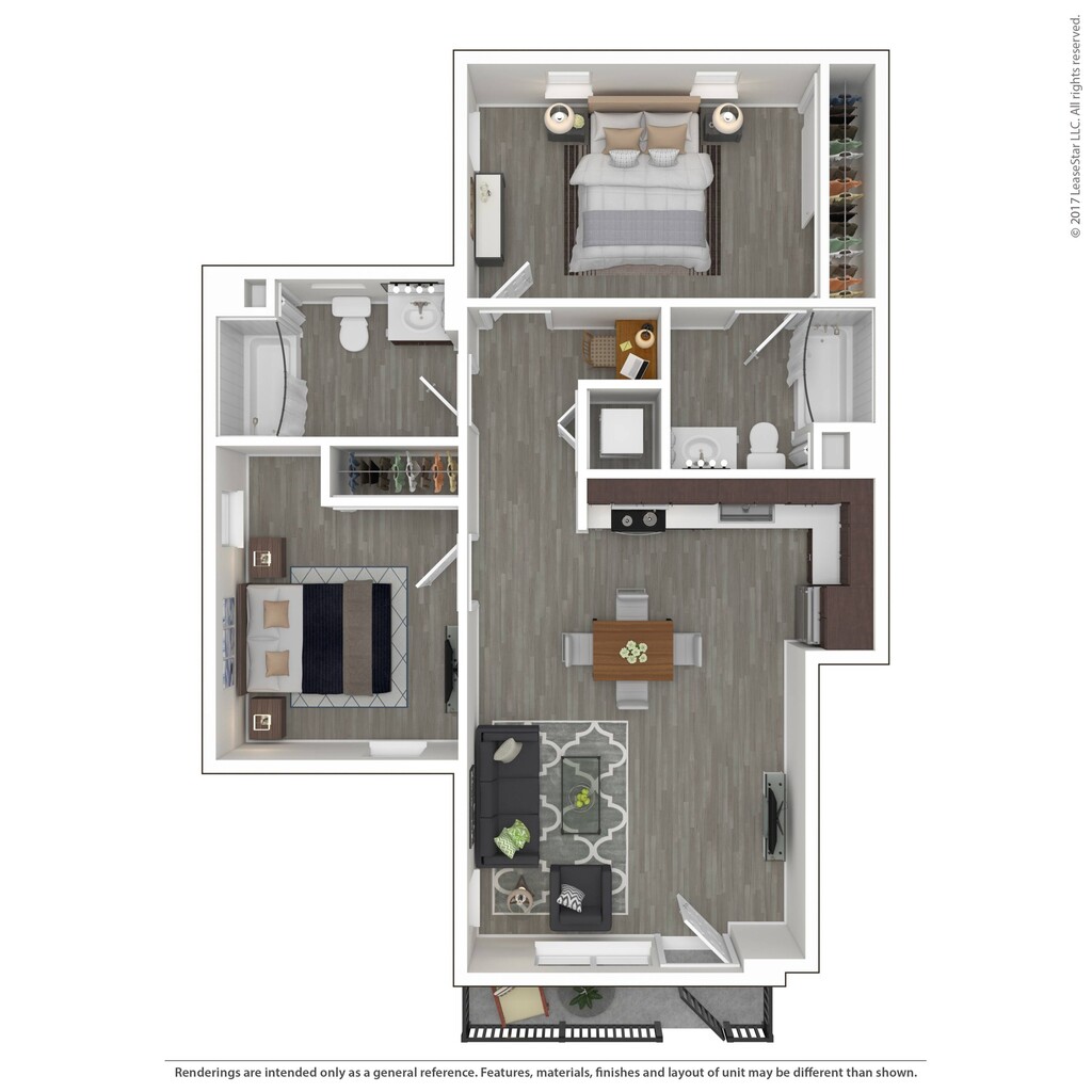 Apartment Model: E2From $2,9812 Bedroom, 2 Bath, 896 sq ftAvailable NowFloor plans are artist's rendering. All dimensions are approximate. Actual product and specifications may vary in dimension or detail. Not all features are available in every rental home. Please see a representative for details.
