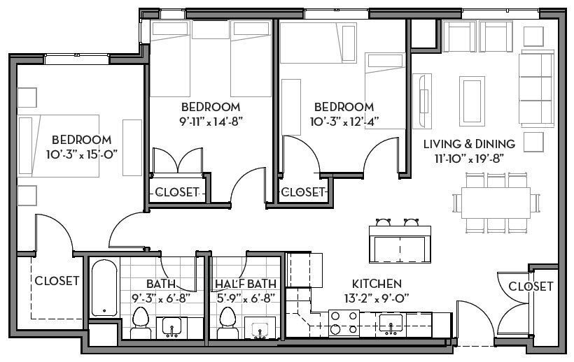 Apartment Model: Three Bedroom 1.5 Bathroom3 Bedroom, 1.5 Bath, 1026-1172 sq ftUnavailable![]()