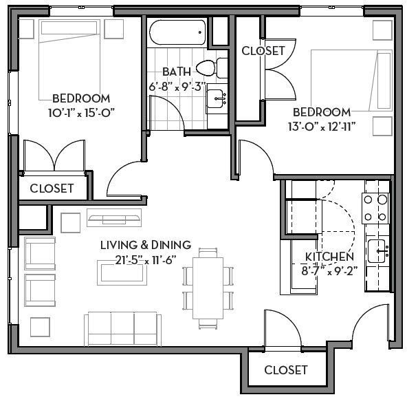 Apartment Model: Two Bedroom One Bathroom2 Bedroom, 1 Bath, 837-896 sq ftUnavailable![]()