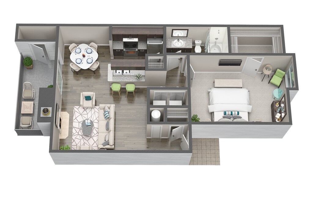 - 1 Bedroom- Floorplan A1 Bed, 1 Bath, 733 sq ft- Model Gallery- Floorplans- Availability Details- Availability Date - Unit - Sq Ft - Call for Availability - A - 733 sq ft - Model Amenities and Features- Features- Air Conditioning