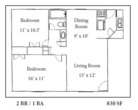 Apartment Model: 2x12 Bedroom, 1 Bath, 830 sq ftUnavailable![]()