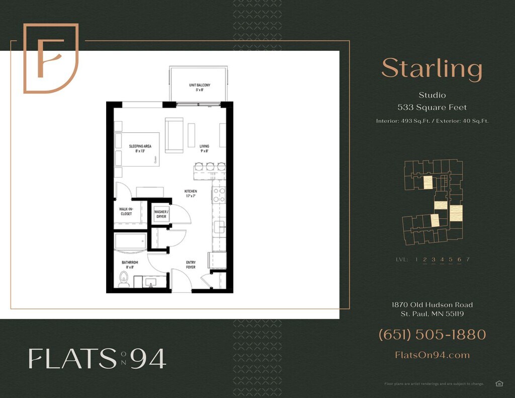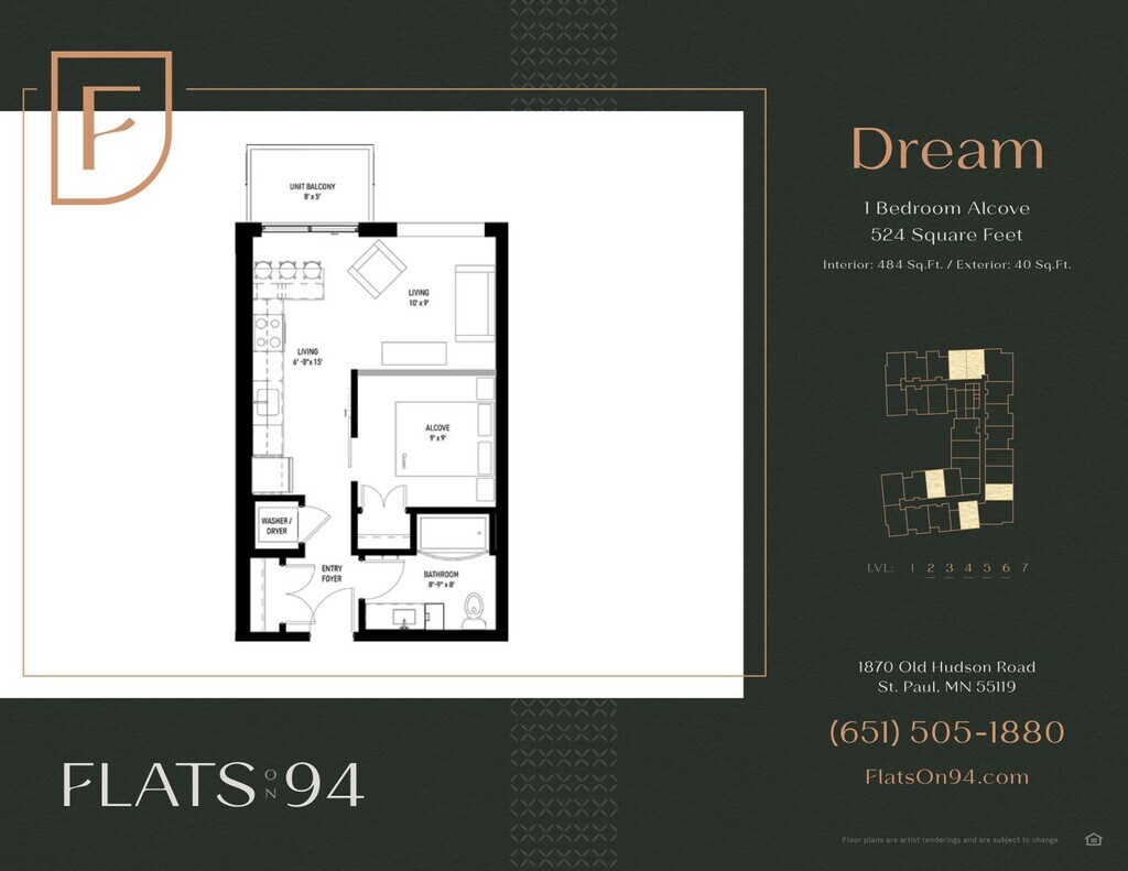 This carefully crafted 524 sq. ft. floor plan is designed to redefine modern living. The sleek kitchen peninsula invites culinary adventures, while the tranquil balcony offers a serene escape. Discover the perfect balance of privacy and openness with the partially enclosed bedroom, making Dream the ultimate canvas for your ideal lifestyle. Unveil your dreams in this captivating space. Flats on 94 is located near the eastern suburbs between downtown St.paul and Hudson, Wisconsin. Tons of shopping and restaurants within a mile. Stay active and energized in our state-of-the-art gym, fully equipped to meet all your fitness goals. Find your inner peace and balance in our serene yoga room, perfect for a relaxing practice. Entertain friends and family at our inviting grill station, where delicious meals and cherished memories are made. Unwind and socialize in our spacious gather room or social room, ideal spaces for community events and gatherings. County: Ramsey | Area Code: 651 | School District: #625 NOTE: Photos are a representation of the property and not the specific photos for the advertised apartment. One-time $200 administrative fee due at lease signing
