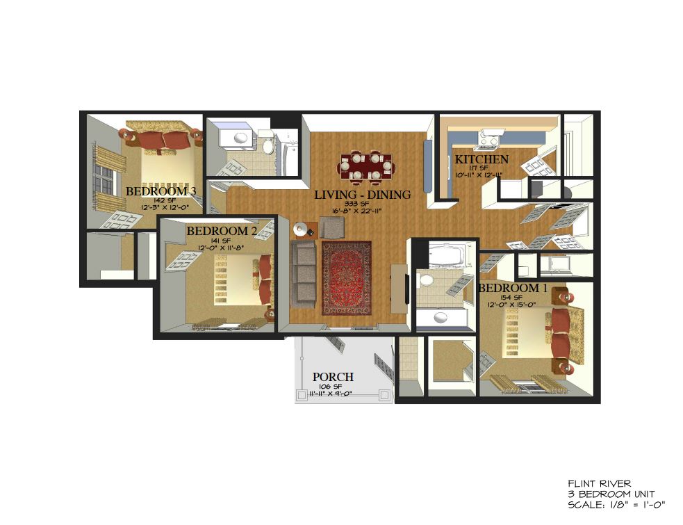 2 Bedroom to 3 Bedroom Apartments at Flint River Apartments currently range from $1,400 to $1,585