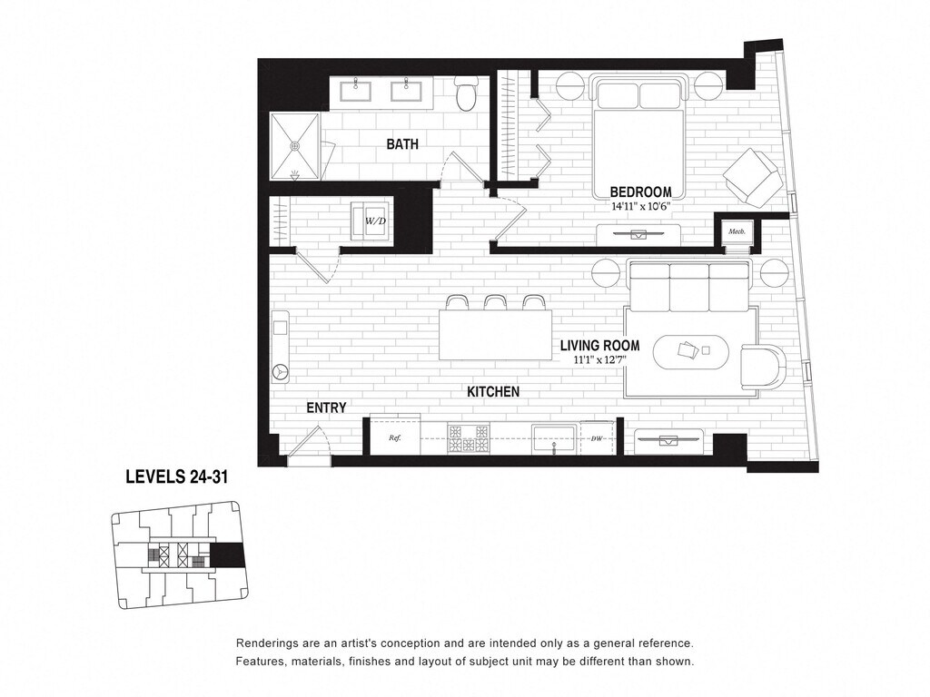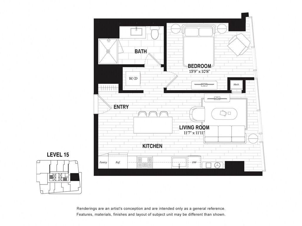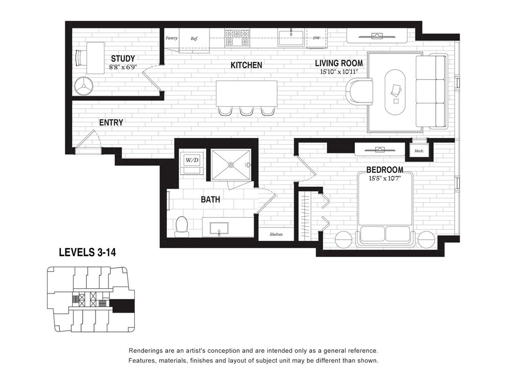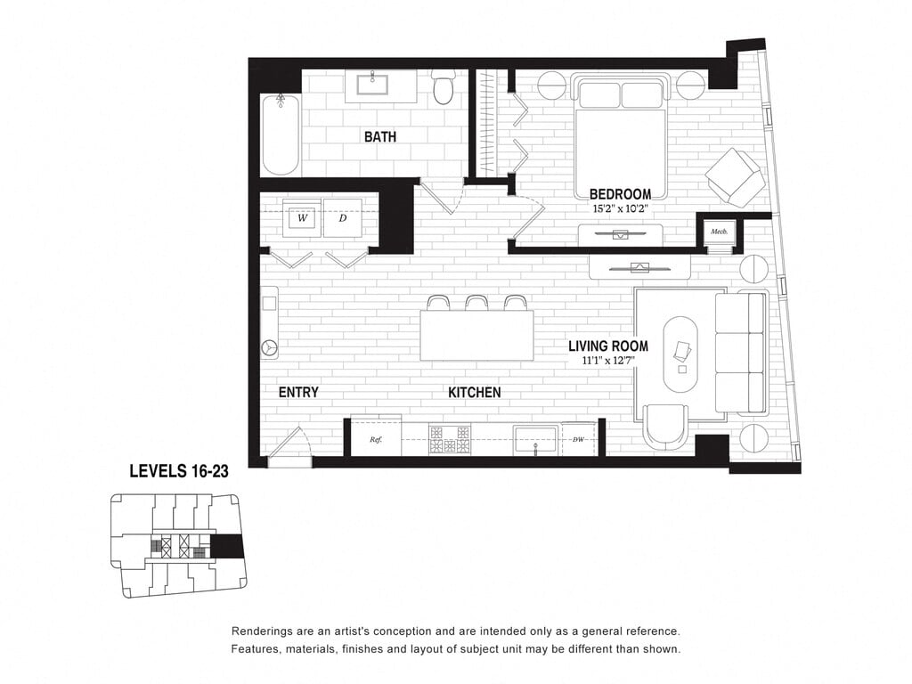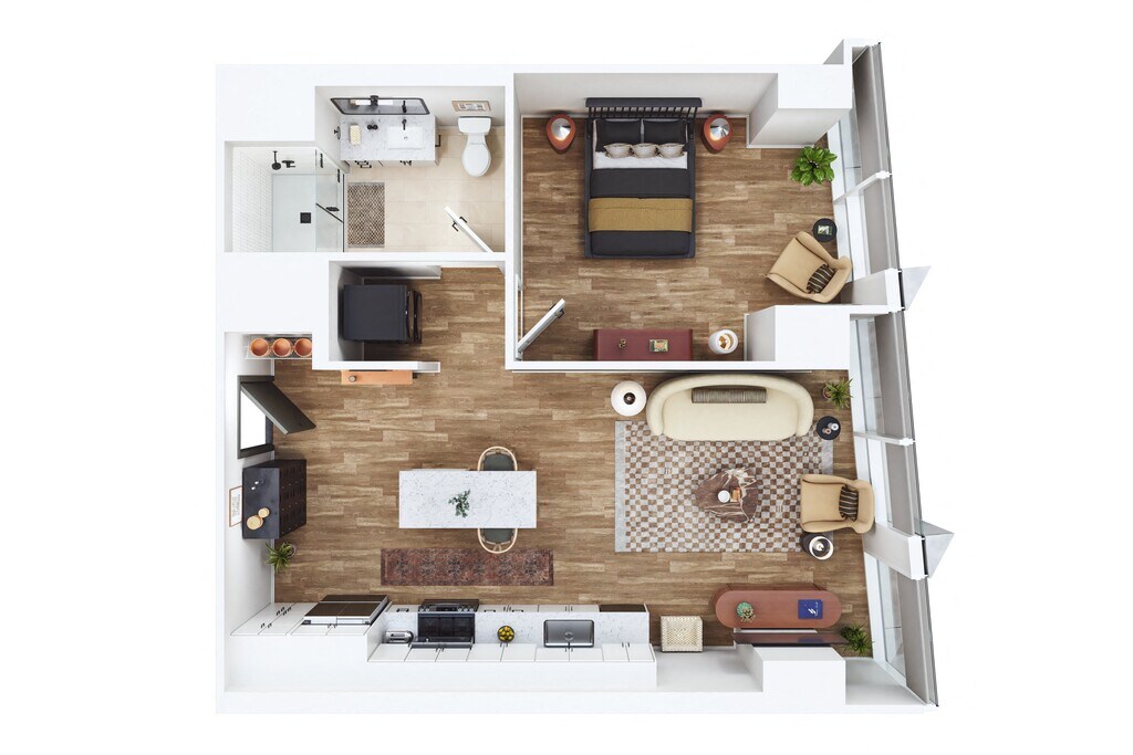 Apartment Model: Studio - FFrom $2,690Studio, 1 Bath, 632 sq ftAvailable January 16, 2026Floor plans are artist's rendering. All dimensions are approximate. Actual product and specifications may vary in dimension or detail. Not all features are available in every rental home. Prices and availability are subject to change. Base rent is based on monthly frequency. Additional fees may apply, such as but not limited to package delivery, trash, water, amenities, etc. Deposits vary. Please see a representative for details.