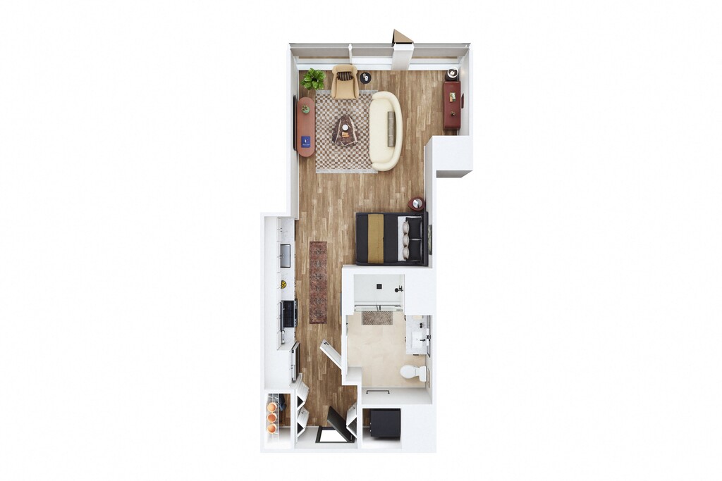 Studio - E - Floorplan 1 Floor plans are artist's rendering. All dimensions are approximate. Actual product and specifications may vary in dimension or detail. Not all features are available in every rental home. Prices and availability are subject to change. Base rent is based on monthly frequency. Additional fees may apply, such as but not limited to package delivery, trash, water, amenities, etc. Deposits vary. Please see a representative for details.