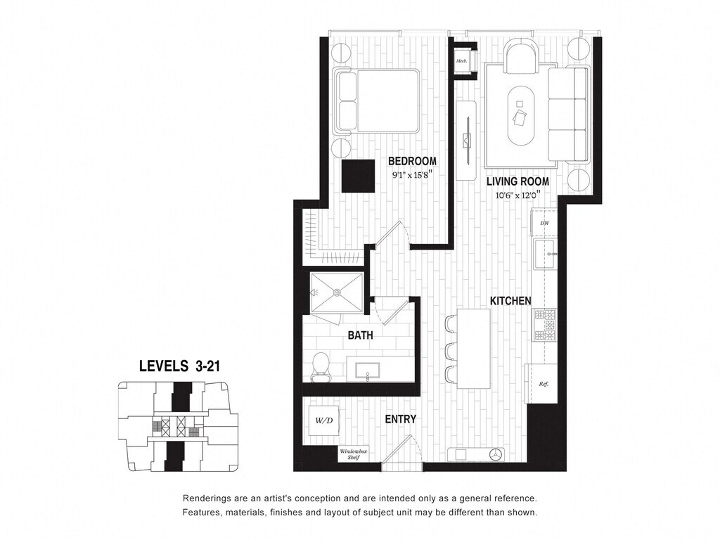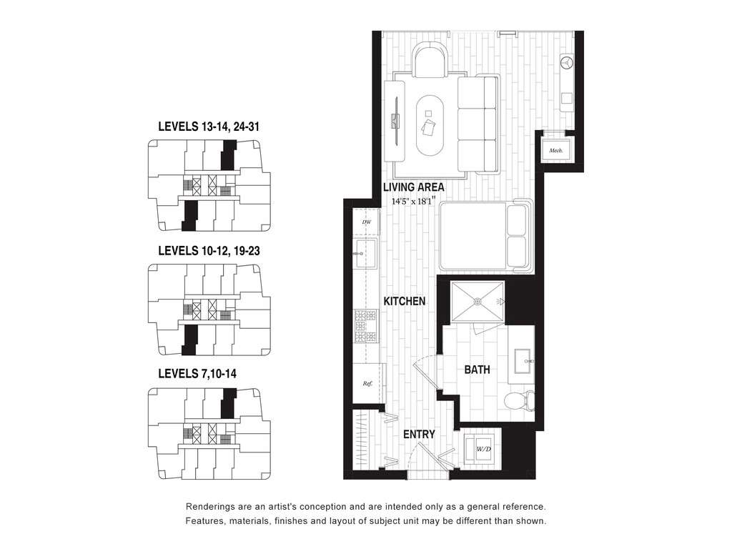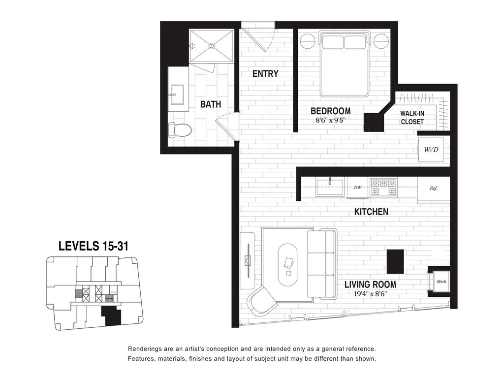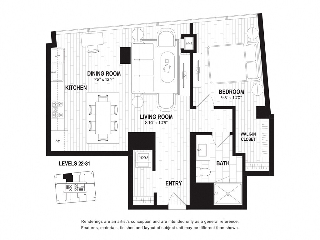 Studio - A - Floorplan 1 Floor plans are artist's rendering. All dimensions are approximate. Actual product and specifications may vary in dimension or detail. Not all features are available in every rental home. Prices and availability are subject to change. Base rent is based on monthly frequency. Additional fees may apply, such as but not limited to package delivery, trash, water, amenities, etc. Deposits vary. Please see a representative for details.