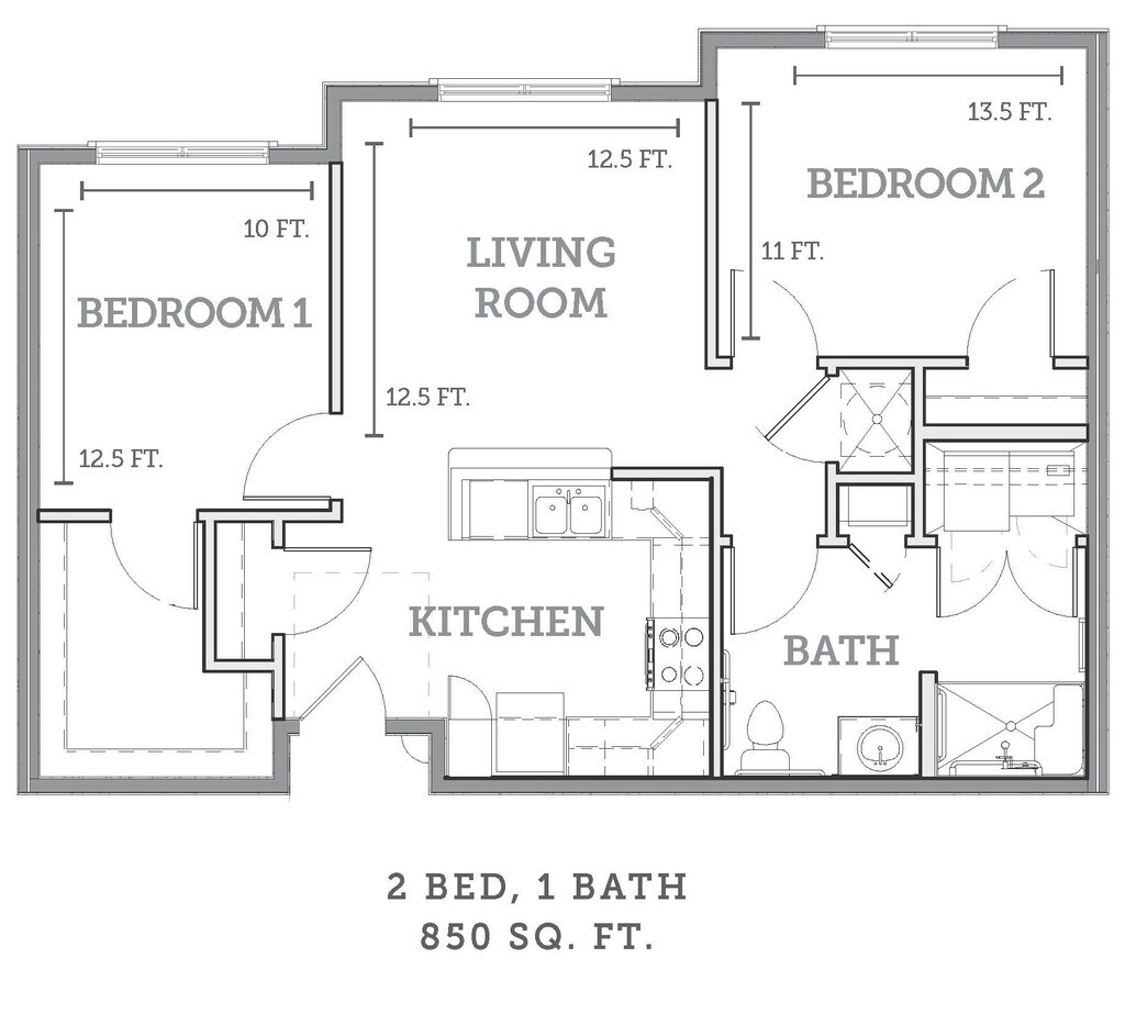 - 2 Bedrooms- Floorplan 2x12 Beds, 1 Bath, 850 sq ft- Availability Details- Availability Date - Unit - Sq Ft - Unavailable - 2x1 - 850 sq ft