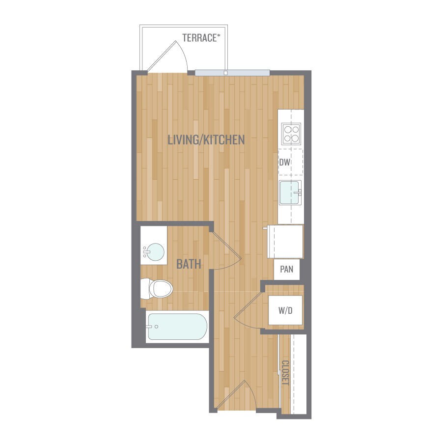 Apartment Model: Studio AFrom $1,343Studio, 1 Bath, 333 sq ftAvailable NowFloor plans are artist's rendering. All dimensions are approximate. Actual product and specifications may vary in dimension or detail. Not all features are available in every rental home. Prices and availability are subject to change. Base rent is based on monthly frequency. Additional fees may apply, such as but not limited to package delivery, trash, water, amenities, etc. Deposits vary. Please see a representative for details.