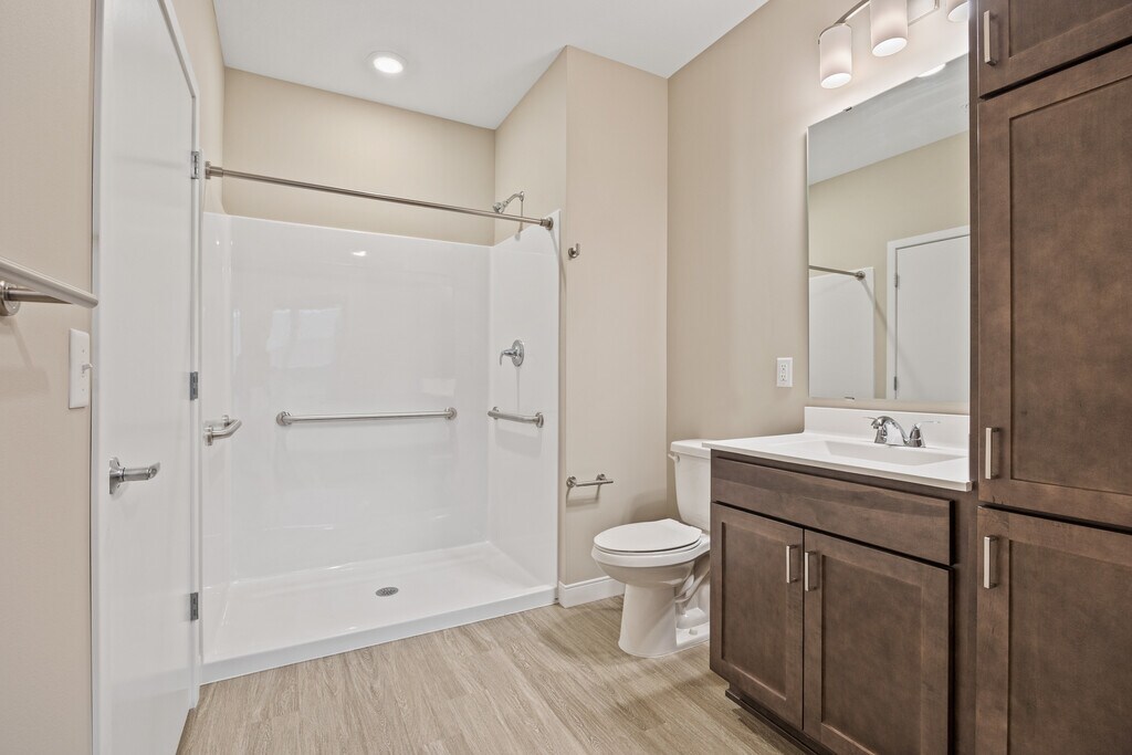 - Walk-in showers + handrails