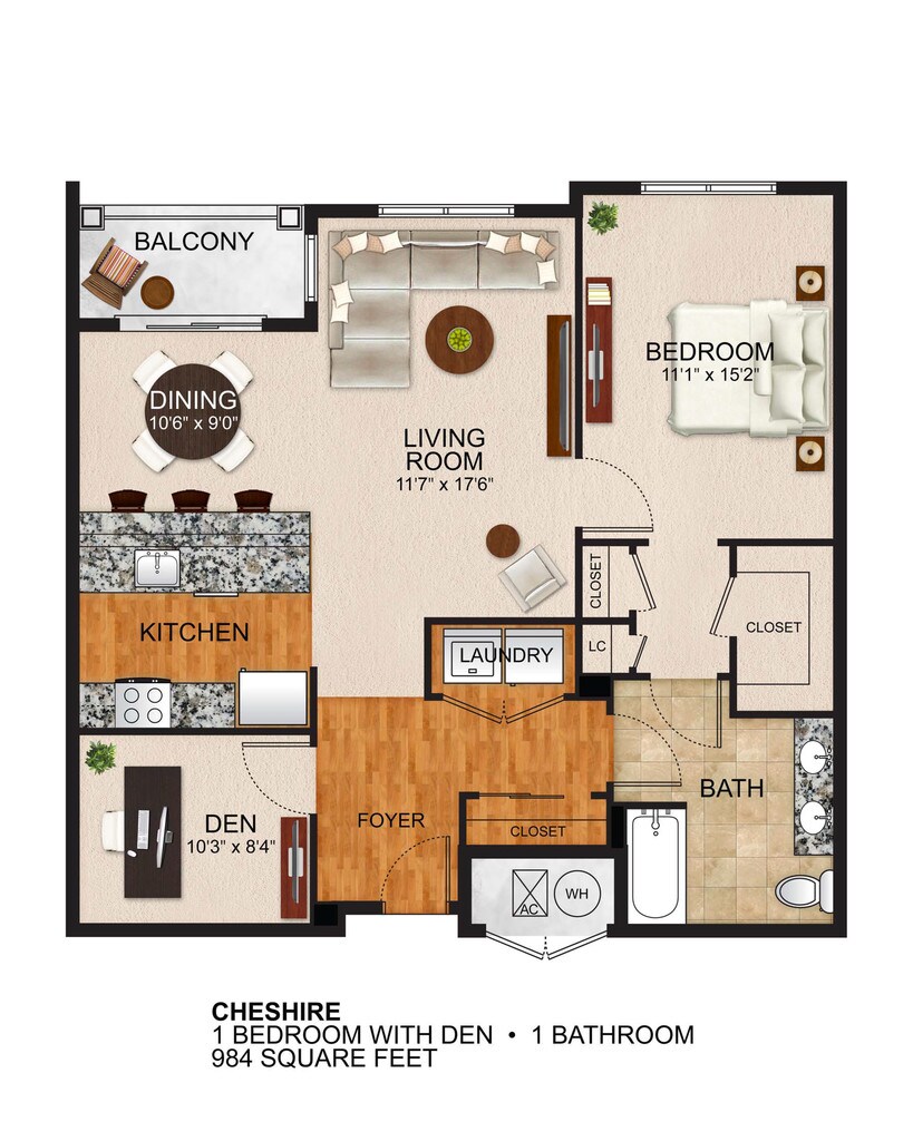 Apartment Model: CameoFrom $1,8931 Bedroom, 1 Bath, 947 sq ftUnavailable![]() - Cameo - Floorplan 1 - Chesire1 Bed, 1 Bath, 984 sq ft- Model Gallery- Floorplans- Availability Details- Price - Availability Date - Unit - Sq Ft - From $1,963 - Call for Availability - Chesire - 984 sq ft - Model Amenities and Features- Features- Balcony