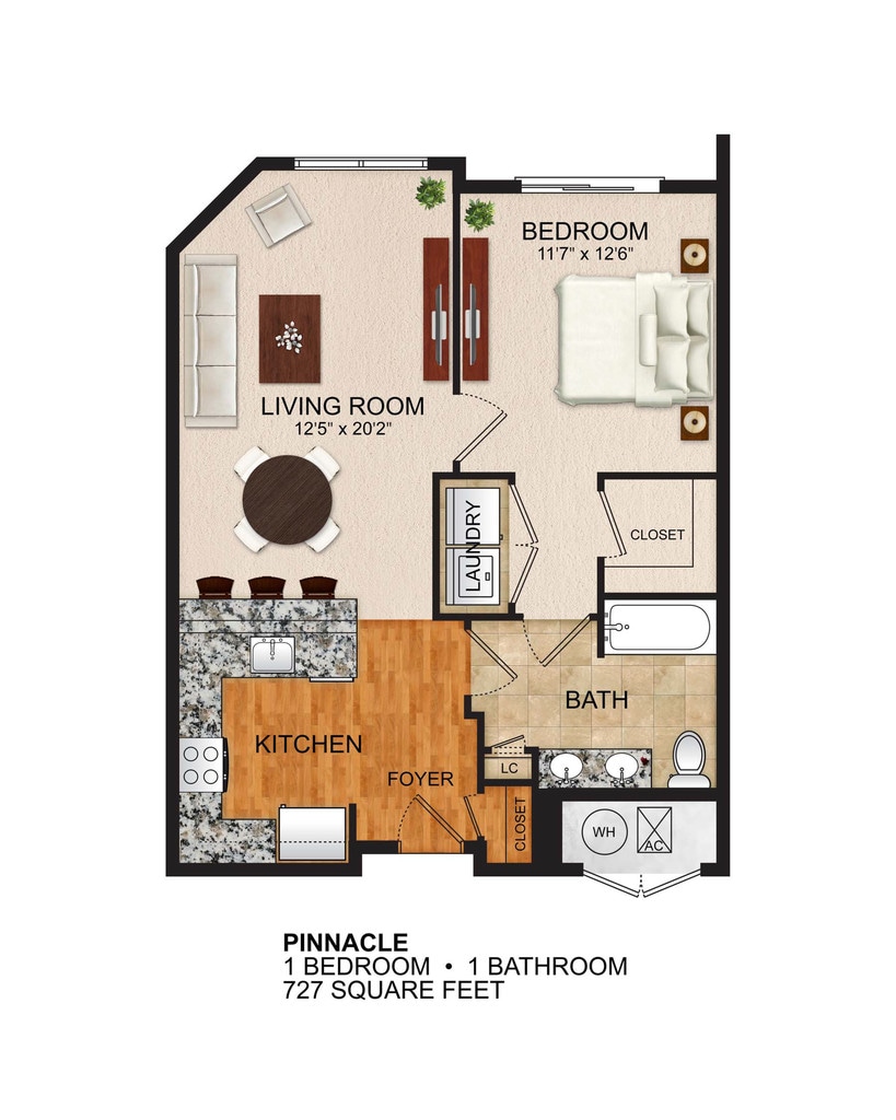 Apartment Model: PinnacleFrom $1,7931 Bedroom, 1 Bath, 727 sq ftUnavailable![]() - Pinnacle - Floorplan 1 ![]() - Pinnacle - Floorplan 2 - Premier1 Bed, 1 Bath, 796 sq ft- Model Gallery- Floorplans- Availability Details- Price - Availability Date - Unit - Sq Ft - From $1,613 - Call for Availability - Premier - 796 sq ft - Model Amenities and Features- Features- Air Conditioning