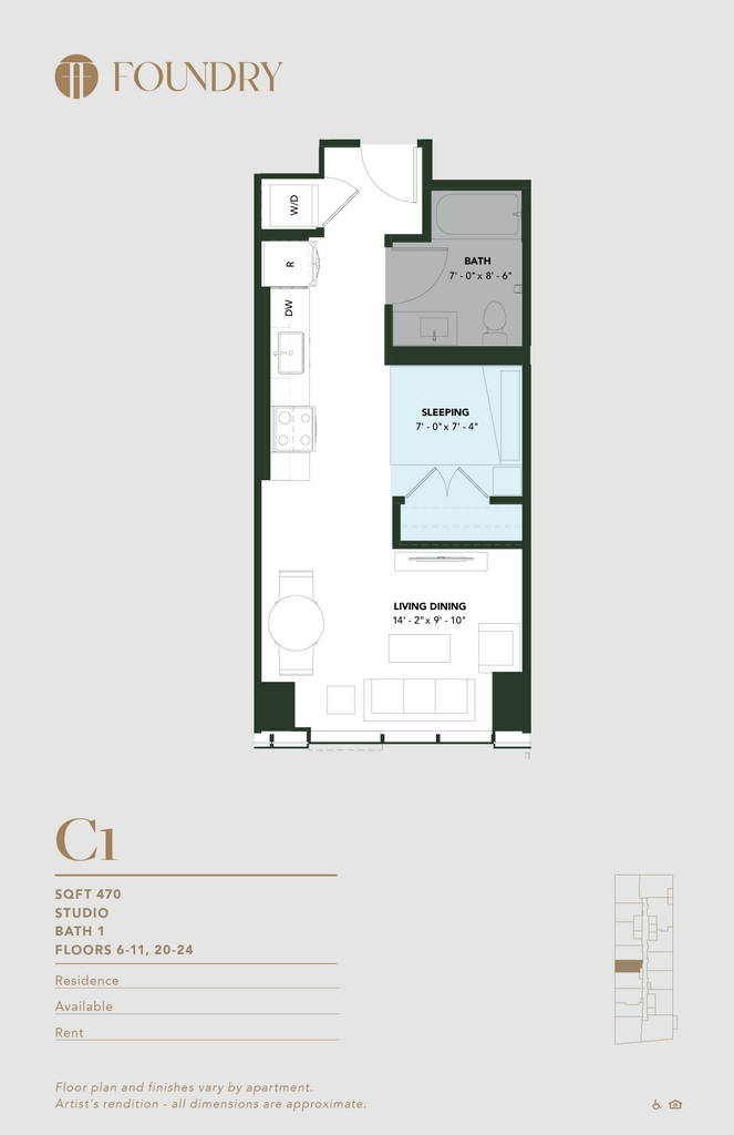 Apartment Model: C1From $2,110Studio, 1 Bath, 470 sq ftUnavailableC1 - Floorplan 1 C1 - Floorplan 2 1 Bedroom