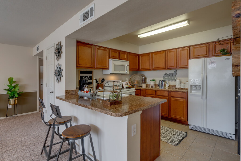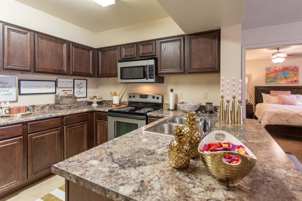Make your dreams a reality in a new home at Fountain Lake. Set on lush courtyard grounds near Oklahoma City, our community offers one and two bedroom luxury apartments for rent in South Edmond, OK near the University of Oklahoma. Our upscale apartments and lofts offer large floor plans with incredible vaulted ceilings, filling your space with natural light. Complete with a contemporary chef’s kitchen and stainless-steel appliances, your home will inspire you to new heights. To complement the design-inspired interiors, we offer a collection of top-tier amenities. Looking for a great workout? Make sure to check out our endurance fitness center equipped with free weights or go for a swim in the resort-inspired outdoor pool.