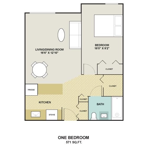 1 Bed, 1 Bath, 570 sq ftModel Gallery