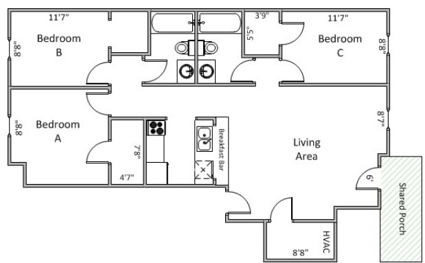 2 Bedrooms 1 Bath - Floorplan 2 3 Bedrooms