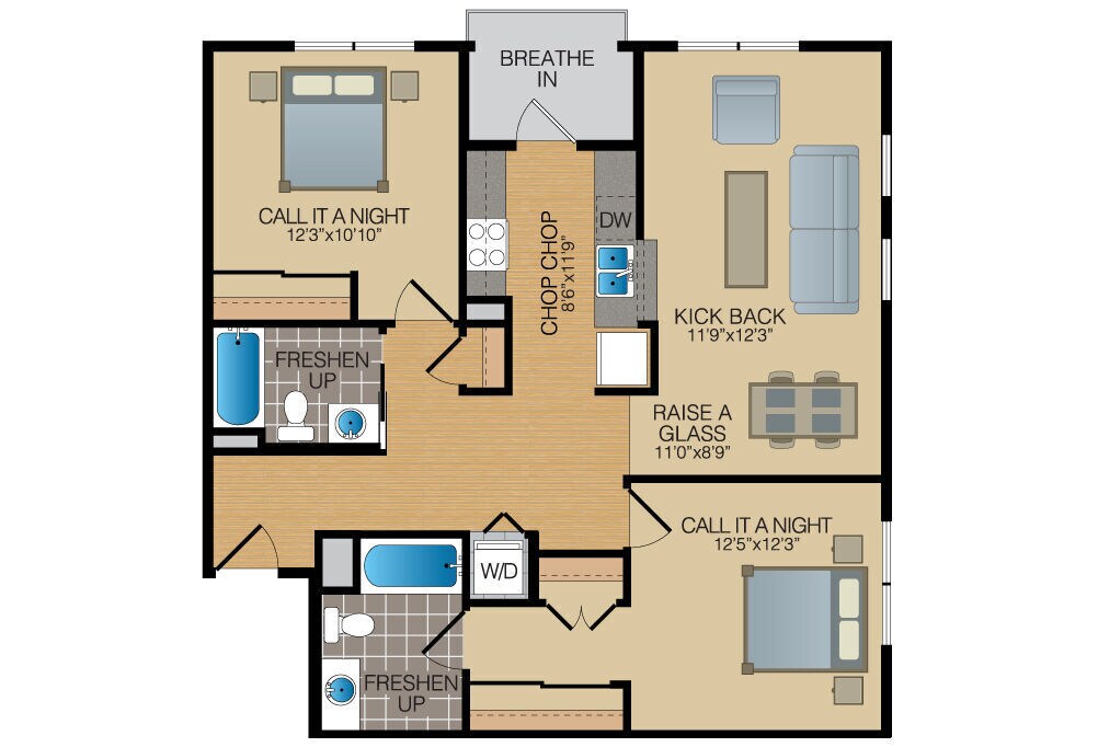2 Beds, 2 Baths, 1307 sq ftAvailable NowLargest 2 BedroomThis is the largest 2 Bedroom at this PropertyModel Gallery