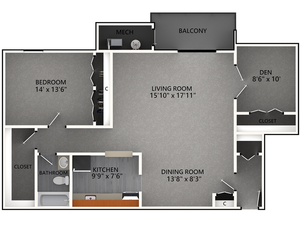 1 Bed 1 Bath Den - Floorplan 2 Apartment Unit: 203Apartment Model: 1 Bed 1 Bath Den$1,4551 Bedroom, 1 Bath, 832 sq ftAvailable December 12, 20252 Bedrooms