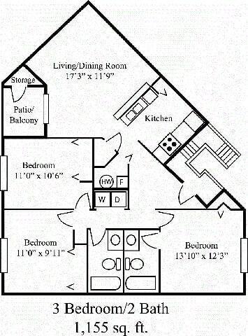 Apartment Model: 3 Bed LargeCall For Rates3 Bedroom, 2 Bath, 1155 sq ftUnavailableFloor plans are artist's rendering. All dimensions are approximate. Actual product and specifications may vary in dimension or detail. Not all features are available in every rental home. Prices and availability are subject to change. Base rent is based on monthly frequency. Additional fees may apply, such as but not limited to package delivery, trash, water, amenities, etc. Deposits vary. Please see a representative for details.