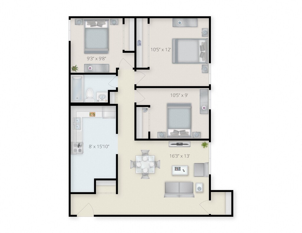 3 Beds, 1 Bath, 974 sq ftAvailable Nov 6Largest 3 BedroomThis is the largest 3 Bedroom at this PropertyModel Gallery