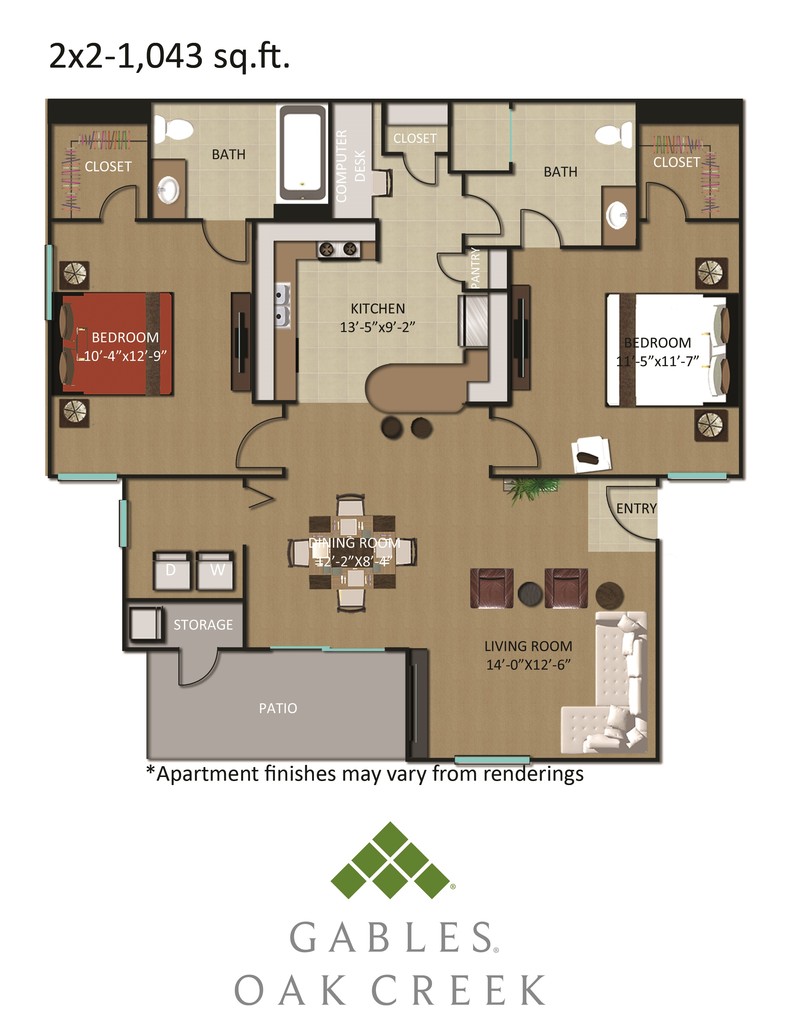 2 Beds, 2 Baths, 1043 sq ftAvailable NowModel Gallery