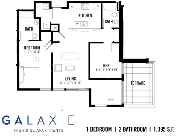 Apartment Model: 1 Bedroom + Den$2,4591 Bedroom, 2 Bath, 1095 sq ftAvailable NowFloor plans are artist's rendering. All dimensions are approximate. Actual product and specifications may vary in dimension or detail. Not all features are available in every rental home. Please see a representative for details.