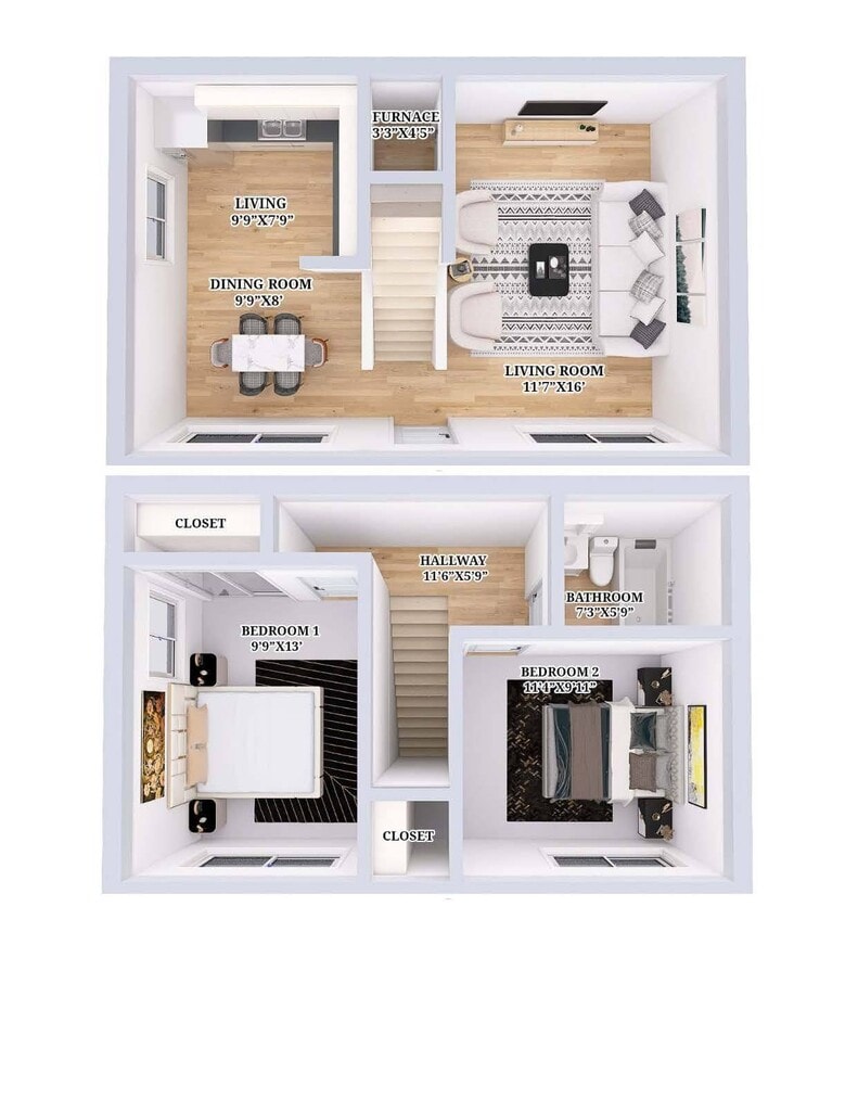 Apartment Model: 2 Bedroom 1 Bath Deluxe TownhouseCall For Rates2 Bedroom, 1 Bath, 745 sq ftUnavailable![]() - 2 Bedroom 1 Bath Deluxe Townhouse - Floorplan 1