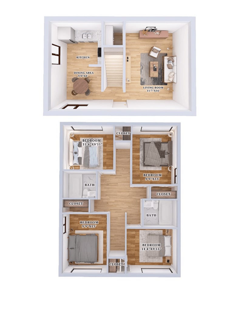 - 4 Bedrooms- 4 bedroom 1 bathroom Townhouse with utility room4 Beds, 1 Bath, 1200 sq ft- Model Gallery- Floorplans- Photos- Availability Details- Availability Date - Unit - Sq Ft - Call for Availability - 4 bedroom 1 bathroom Townhouse with utility room - 1200 sq ft - Model Amenities and Features- Features- Air Conditioning