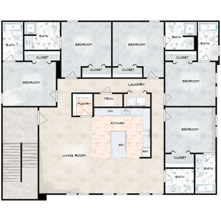 Apartment Model: 6 Bedroom Deluxe By the Bedspace6 Bedroom, 6 Bath, 441 sq ftUnavailable6 Bedroom Deluxe By the Bedspace - Floorplan 1