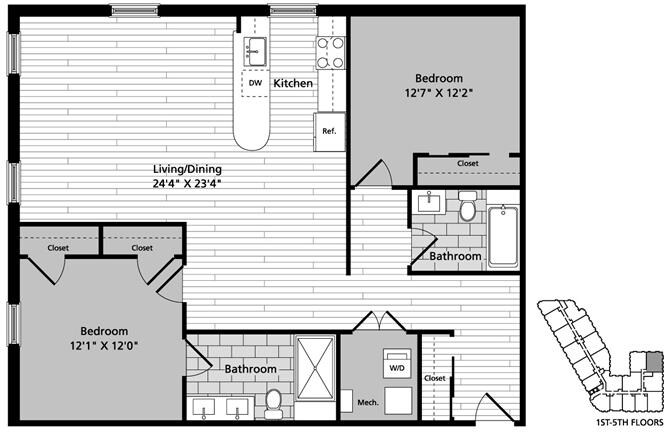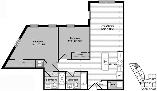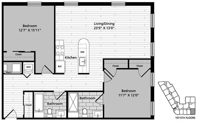 1 Bed, 1.5 Baths, 917 sq ftLargest 1 BedroomThis is the largest 1 Bedroom at this PropertyModel Gallery