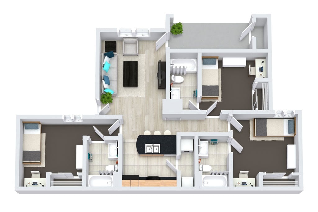 D1 - Floorplan 1 Apartment Unit: PrivateApartment Model: D14 Bedroom, 4 Bath, 1364 sq ftAvailable August 14, 2026Apartment Unit: Private PremiumApartment Model: D14 Bedroom, 4 Bath, 1364 sq ftAvailable August 14, 2026