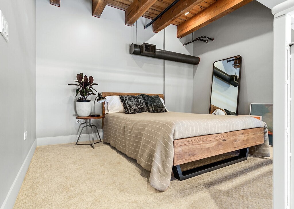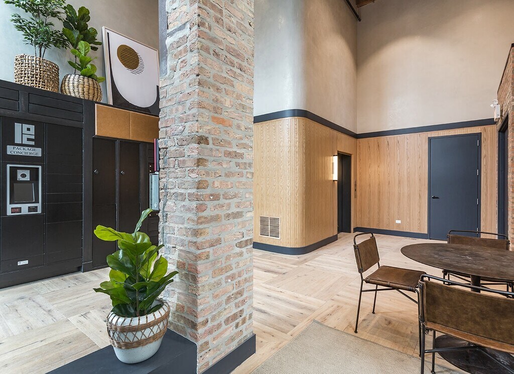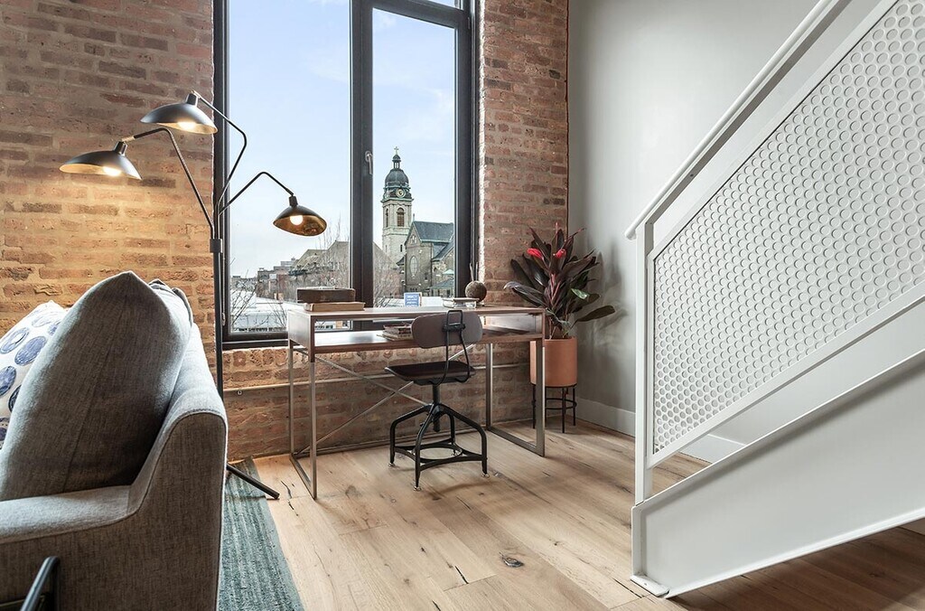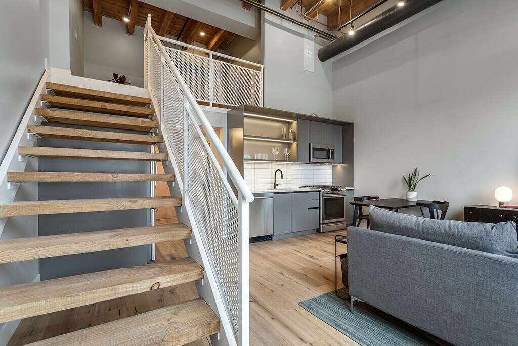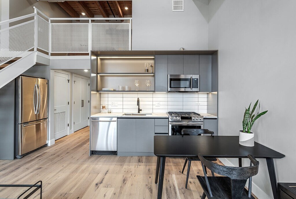 Apartments at Germain House feature white oak hardwood flooring, loft architecture with authentic brick and beams, oversized windows, in-unit washer and dryer, spacious closets in select units, soaring ceilings, and smart home features. Kitchens feature mounted open shelving, stainless steel appliances, soft-close cabinetry, Delta Trinsic fixtures, quartz countertops with marble design and stainless steel sinks.