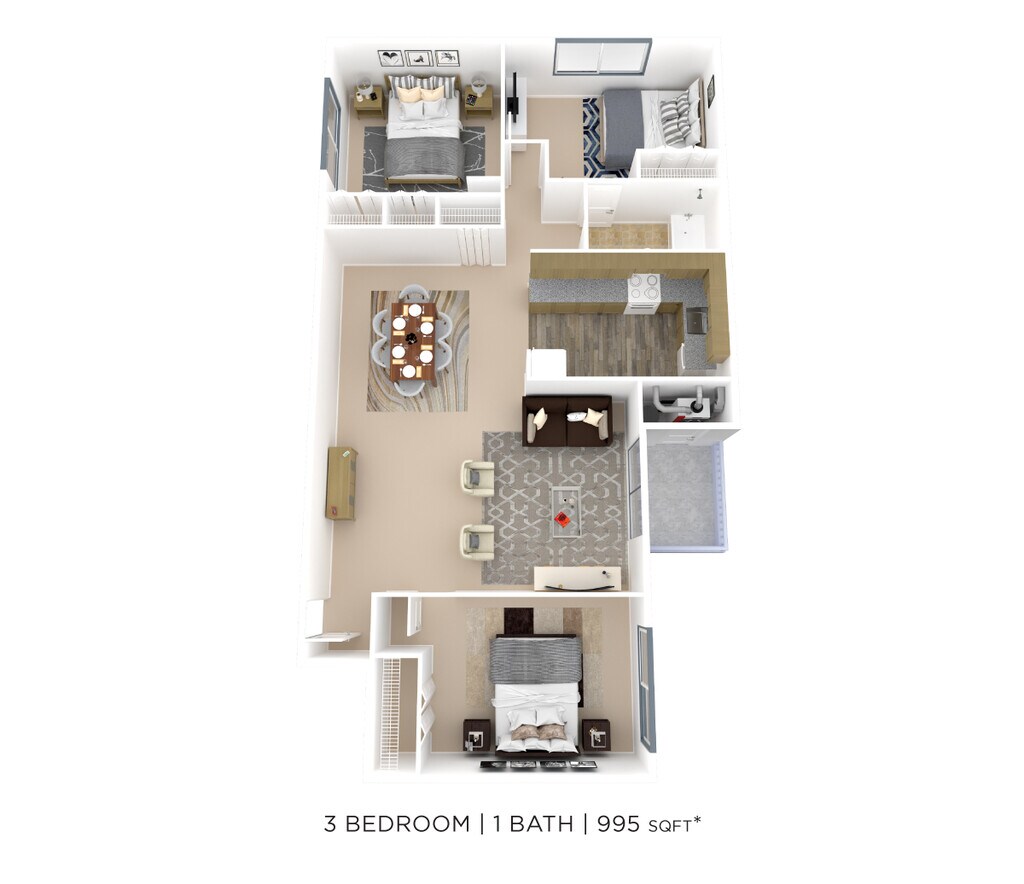 - 3 Bedrooms- Three Bedroom - 995 sqft3 Beds, 1 Bath, 995 sq ft- Model Gallery- Floorplans- Availability Details- Availability Date - Unit - Sq Ft - Call for Availability - Three Bedroom - 995 sqft - 995 sq ft - Model Amenities and Features- Features- Air Conditioning