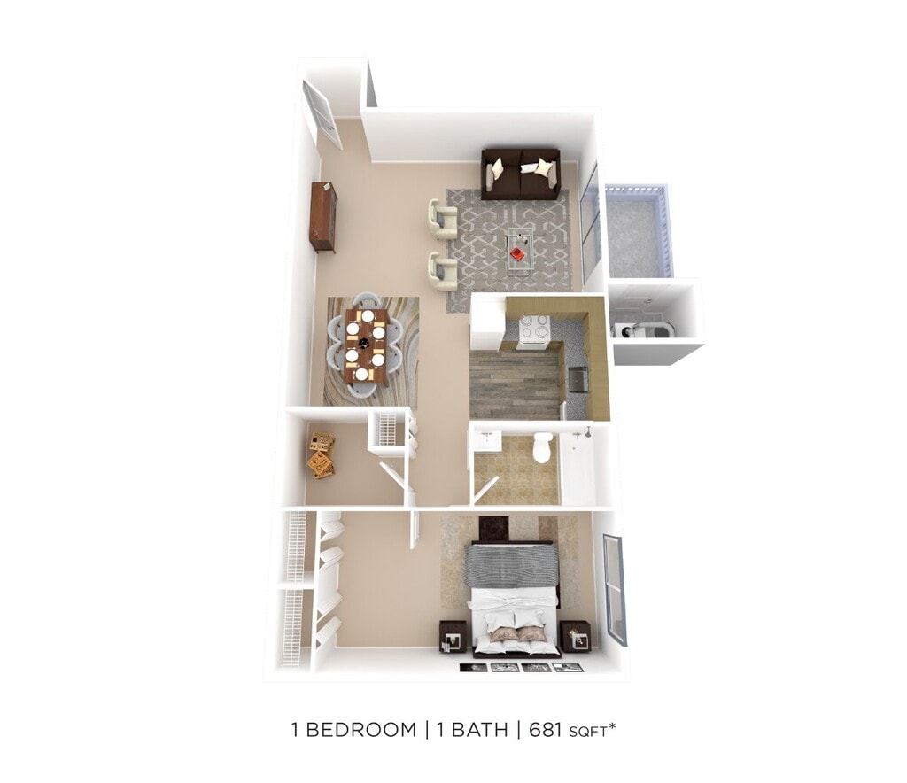 - 1 Bedroom- One Bedroom - 681 sqft- From $1,5051 Bed, 1 Bath, 681 sq ftAvailable Now- Model Gallery- Floorplans- Availability Details- Price - Availability Date - Unit - Sq Ft - $1,505 - Available Now - 460-B4 - 681 - $1,505 - Available Now - 460-C3 - 681 - $1,565 - Available Soon - 471-C3 - 681 - Model Amenities and Features- Features- Air Conditioning
